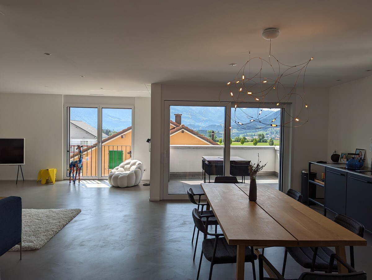 Bienvenue au « Es Guinchets », un logement paisible et chaleureux, aux portes de la nature. Ce vaste appartement mansardé de 125 m2 se trouve au dernier étage d’une maison de deux niveaux et est accessible par ascenseur. Situé dans un quartier tranquille en bordure de campagne à Domdidier, cet appartement cosy est le point de départ idéal de nombreuses excursions (Morat et région des Trois Lacs, Fribourg, Berne, Lausanne, Neuchâtel).