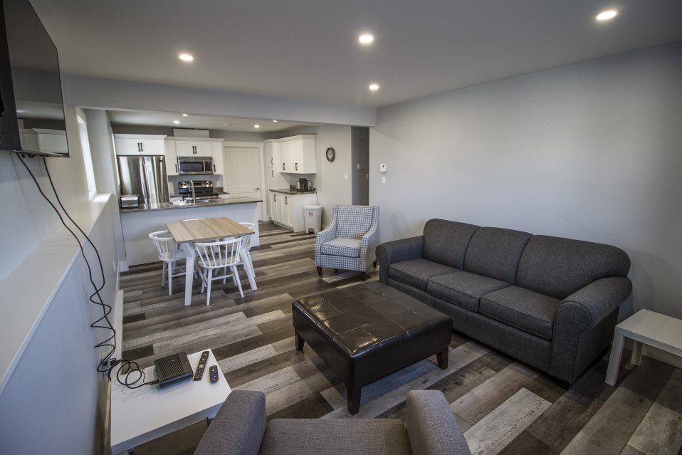 OPEN CONCEPT one bedroom unit with one queen bed and one double pull out sofa bed...fully equipped kitchenette...3pc bath...wireless internet...cable TV...shared patio...and our newest gems a shared campfire site with adirondack seating and a shared 7 person hot tub both located in the backyard...rent on a daily, weekly or monthly rate...laundry service available...pet friendly...close to local supermarket, liquor store, local pub, restaurants, pharmacy, playground with splash pad...