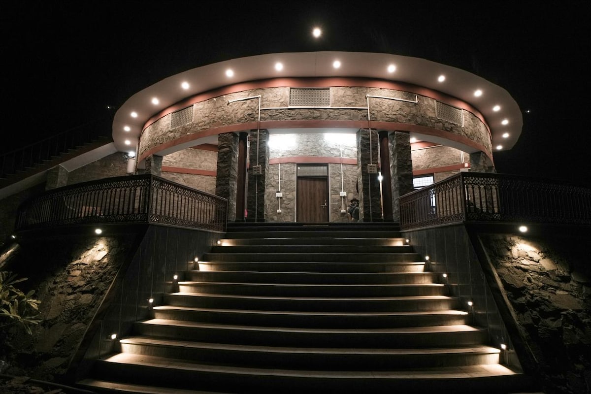 ◆Tucked at the foothills of Ramgarh Fort, this colonial-style villa offers a peaceful retreat surrounded by lush forest & hills! ◆A stone-paved walkway winds through a charming garden & leads to a private pool complete with an outdoor shower—perfect for refreshing dips. ◆Inside, the living room is furnished with a L-shaped sofa, a TV for movie nights & a fireplace for cooler evenings. ◆A cosy balcony with a swing provides a peaceful corner to enjoy the quiet while soaking in the scenic views.