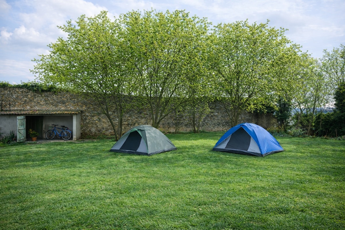 MICA, tente équipée tout confort 12 m² pur coton, rivière à 5 min à pied. Un lieu hors du temps. Sur le même lieu LA COLLINE VAGABONDE : 1 autre tente, une cabane sur pilotis, 1 maison indépendante. La tente, installée à flanc de colline entre pins et châtaigniers. Belle rivière à 5 minutes de marche. Ici nous vivons simplement et en harmonie avec la nature, nous aimons aussi confort et propreté. Cuisine équipée partagée, eau courante et chaude Salle d'eau et WC sec partagés par 2 couples max.