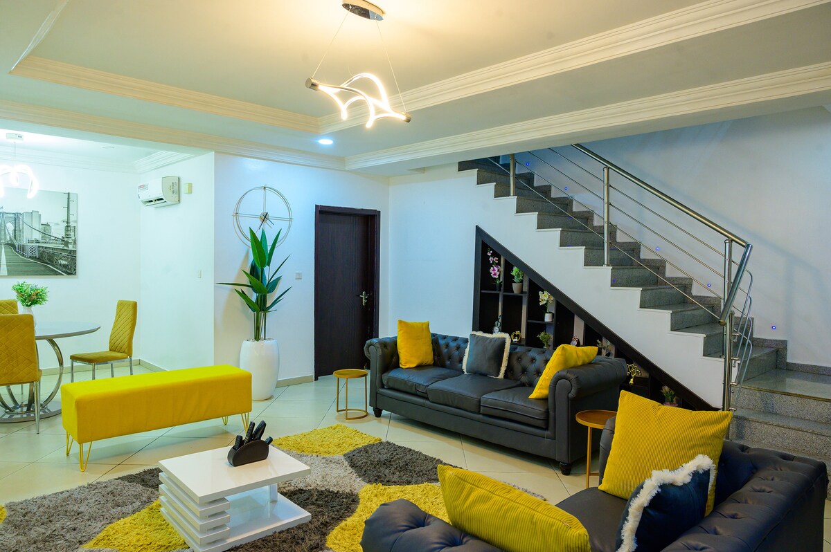 마부시의 미니 에스테이트에서 1층과 1층에 위치한 강화된 보안 도어가 있는 넓은 침실 3개, 욕실 3개 및 욕실 듀플렉스를 즐겨보세요. 우세 2까지 차로 3분, 마이타마의 힐튼까지 7분 거리입니다. 전기는 100kva 인더스트리얼 발전기로 전원을 공급받으며, 인버터 전용 인버터로 전기를 공급받습니다. 청소 담당자가 격일로 들어오고, 매 숙박 후 소독하며, 흰색 시트만 사용하고, 아파트에는 5G 와이파이가 있는 스마트 TV가 여러 대 있습니다.