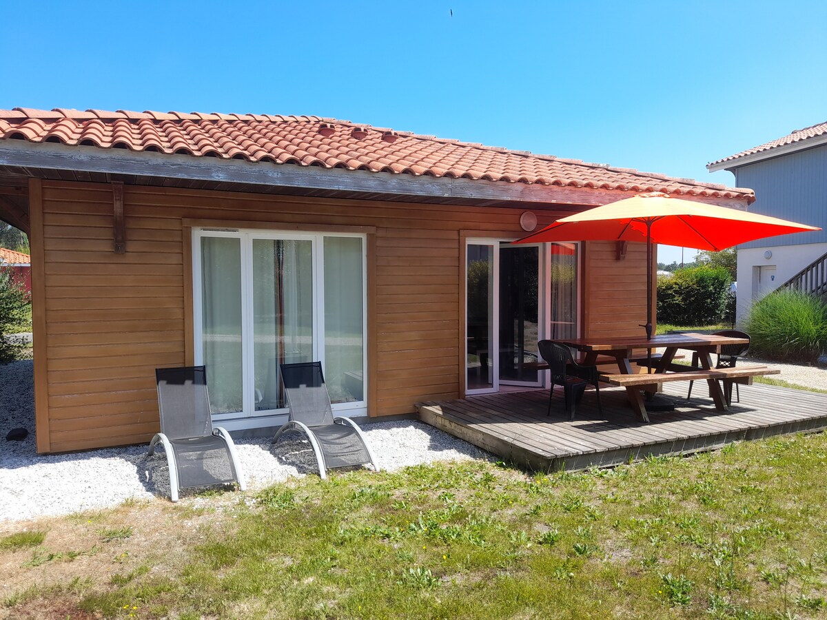 Ce cottage de 35m2 avec 2 terrasses : une de 15m2 abritée et une de 25m2 coté jardin, offre un séjour détente et nature pour toute la famille. Il est situé au sein du Domaine des Pins D'Or, au cœur de la forêt des Landes, à 5 km de la belle plage préservée de Lespecier. Au sein du domaine vous aurez accès à : - une piscine extérieure chauffée - un espace Balneo avec SPA et piscine intérieure - un espace Bien être et un espace Forme (salle de fitness) (en supp) - un tennis - boulodrome…
