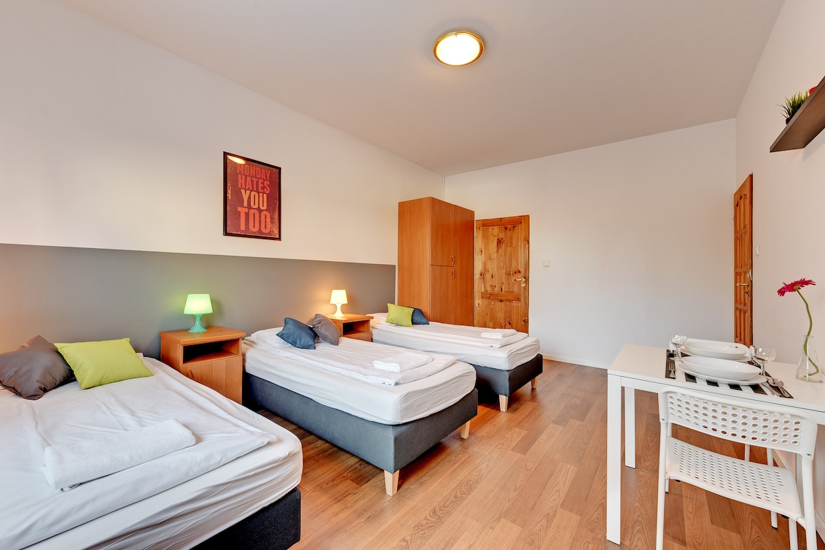 전용 욕실이 있는 트리플룸입니다. 객실에는 - 싱글 침대 3개가 있습니다. - 욕실 - 케이블 채널 시청이 가능한 LCD TV, - 공용 주방 (냉장고, 전기 버너, 전기 주전자, 식기, 냄비) 침구와 타월이 제공됩니다.