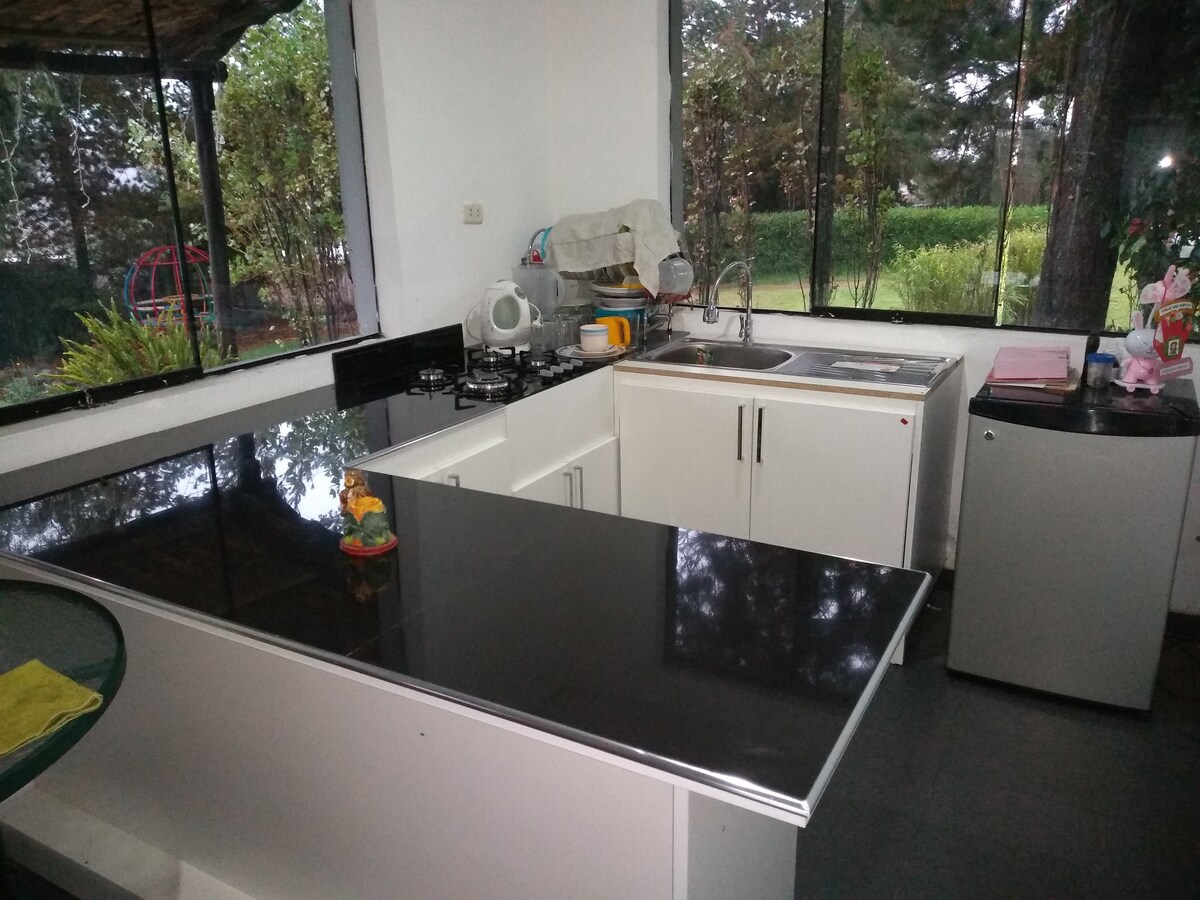 Hermosa casa de campo con frondosos jardines, balcones con vistas espectaculares a la campiña, totalmente equipada con cocina y agua caliente, comedor al aire libre, fogata, barbacoa, horno de barro, juegos al aire libre como sapo, taca taca y mas, y románticos espacios para disfrutar la puesta de sol. Respira aire puro, relajate y disfruta de la privacidad de este maravilloso lugar.