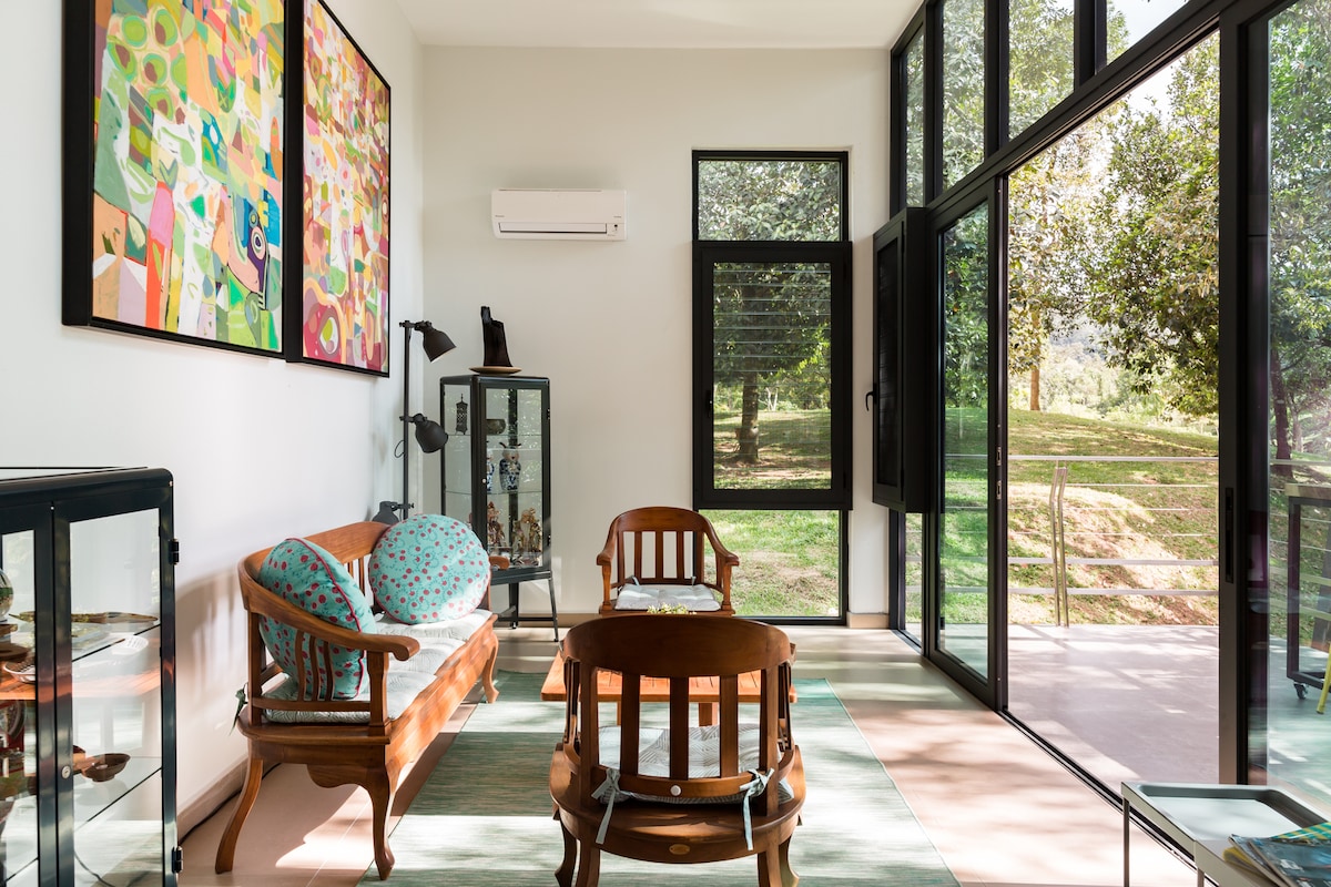 바쁜 도시에서 완벽한 휴식을 취하고 자연과 다시 만날 수 있는 블랙 박스 빌라에 오신 것을 환영합니다. 8,400평방 피트의 전체 빌라로 가족 및 친구 모임에 이상적인 휴양지로, 8명의 게스트를 편안하게 수용할 수 있으며, 추가 매트리스와 야외 캠핑 텐트를 추가하면 최대 13명의 게스트를 수용할 수 있습니다.
