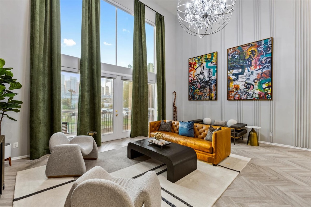 WIDE OPEN SPACE (3 STORY 2600SF) 24/7 Self check-in Amenities: 20ft floor to ceiling windows 120" projector Hi-speed wifi 2nd Story Balcony overlooking Downtown Big Chef's Kitchen Make a cocktail in the minibar and swing in an oil barrel while watching the sunset over downtown. Walk to Minute Maid, Toyota Center, PNC Stadium, Discovery Green, Hilton Americas & George R. Brown Convention Center in minutes! Enjoy attractions like 8th Wonder Brewery, Graffiti Park, Chapman & Kirby + many more!