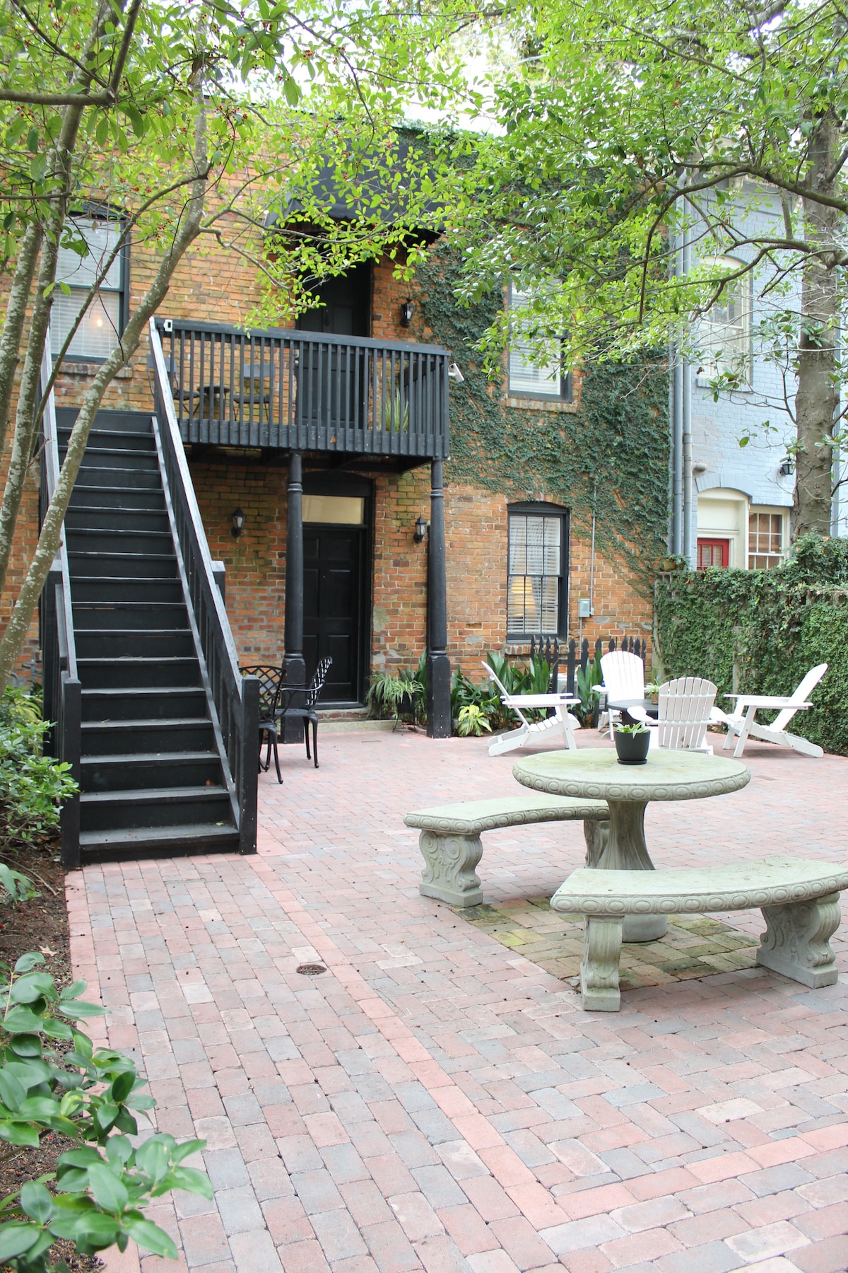 Hideaway Perch at Half Moon House is a light-filled upstairs retreat with a treehouse feel, tucked inside a restored 1914 carriage house. Blending mid-century modern decor with an eclectic, rustic cabin vibe, it offers a comfortable bedroom, a kitchenette, and a private bathroom with a wall-mounted showerhead and a historic shallow soaking tub. A private balcony overlooks the lush garden, creating a peaceful escape just minutes walk from Forsyth Park, Starland, and many top restaurants.