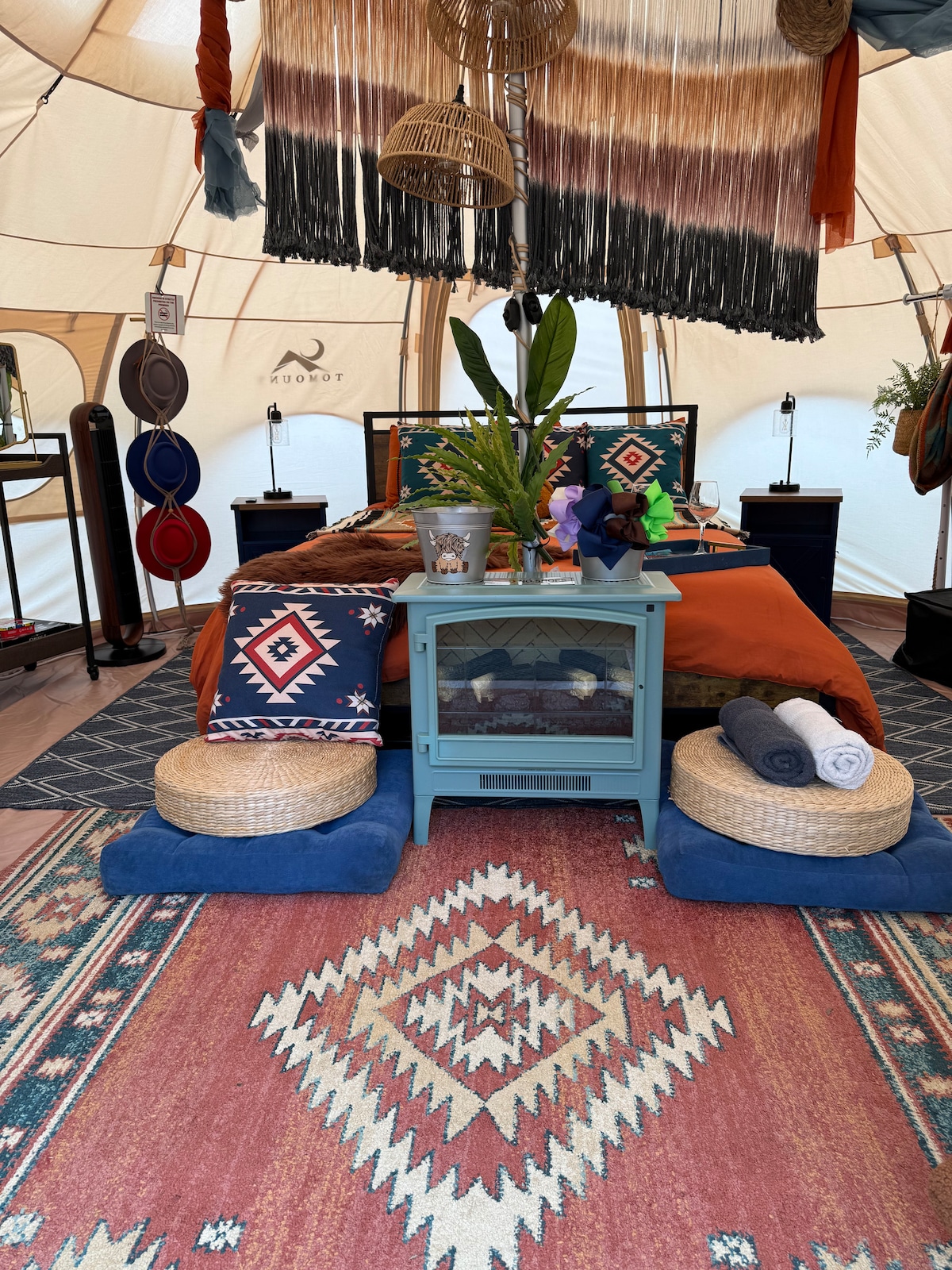 Enjoy an adorable fluffy highland cow, & friendly sheep free-roam near your private, uniquely designed yurt. You may also get surprise visits right to your yurt from our new babies! The space Step inside your uniquely designed glamping haven and discover a blend of rustic charm and modern comfort. Our adorable animal neighbors might even pop by to say hello at your tent!
