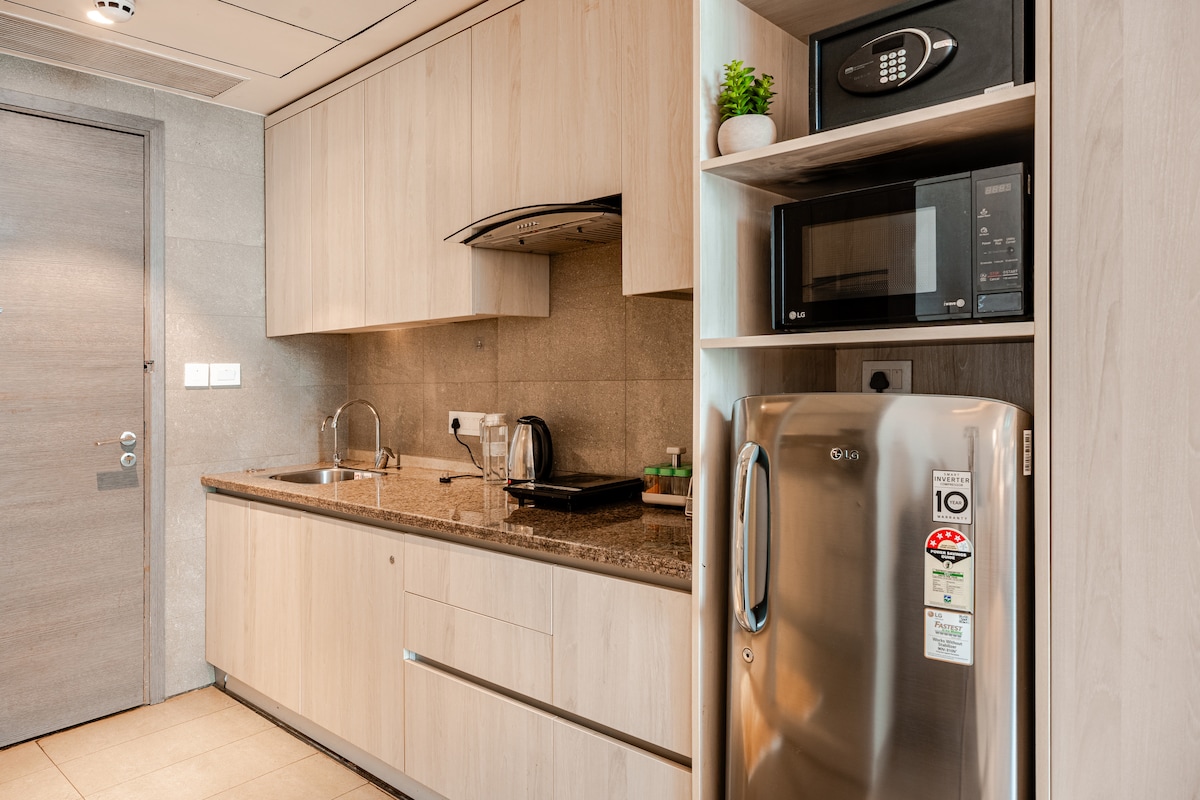 거실과 침실에 에어컨이 구비된 구르가온 섹터 43의 프리미엄 1BHK 서비스 아파트, 인덕션, 전자레인지, 식기류가 구비된 간이 주방. 골드 수크 몰 및 샬롬 힐스 학교까지 도보로 갈 수 있는 고급 지역에 위치하고 있으며, 밀레니엄 시티 센터 지하철에서 2.2km, 포티스 병원에서 2.1km 거리에 있습니다. 외국인 게스트 환영합니다. 얼리 체크인은 이용 가능 여부에 따라 달라질 수 있으며, 500루피가 부과되며, 레이트 체크아웃도 이후 3시간마다 500루피가 추가됩니다.