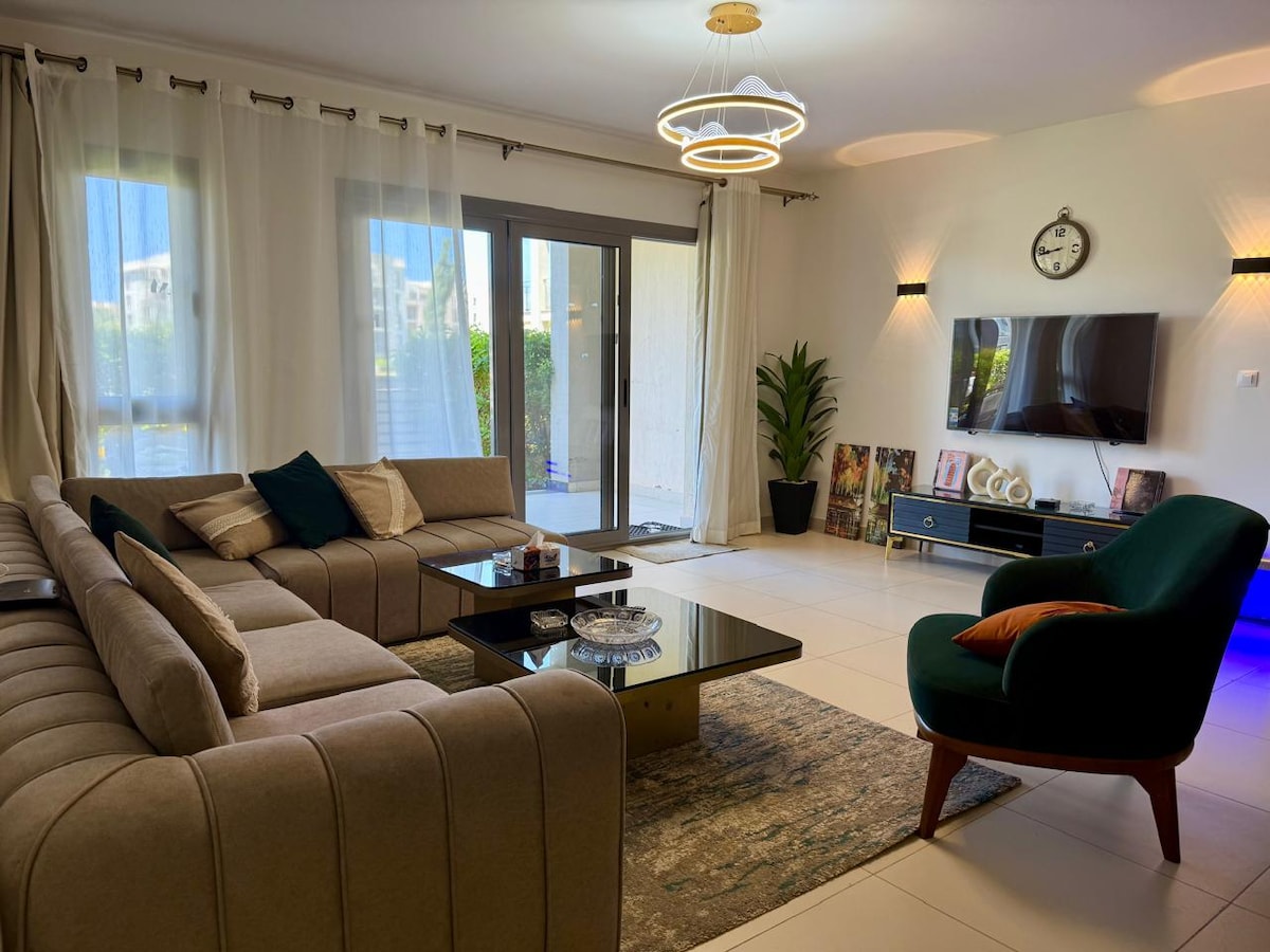 마라시에서 스타일 있게 휴식을 즐기세요! 수영할 수 있는 석호, 마리나, 바다의 전망을 자랑하는 침실 2개 숙소입니다. 마라시 마리나의 엘리트 상점과 레스토랑까지 2분 거리에 있습니다. 50인치 스마트 TV가 있는 전용 퀸 베드룸, 트윈 베드룸, 액티브 넷플릭스, OSN, 샤히드 구독이 있는 65인치 스마트 TV, 대리석 식당, 완비된 주방. 요청 시 접이식 싱글 침대를 제공하여 5인까지 수용할 수 있습니다. 라군 무료 이용. 추가 요금으로 해변 이용권, 골프 카트, 매일 청소 서비스를 이용하실 수 있습니다.