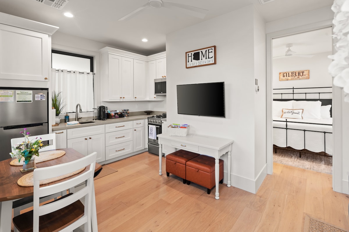 길버트 시내 한가운데에 위치한 이 새로운 작은 게스트하우스를 즐겨보세요. 시내에서 동쪽으로 한 블록 거리에 있습니다. 이 독특한 게스트하우스에는 침실 1개(킹사이즈 침대)와 욕실 1개가 있어 매우 개인적인 느낌을 줍니다. 작은 파티오는 길버트 시내에서 다음에 하고 싶은 일을 앉아서 생각하는 데 안성맞춤입니다. 하룻밤을 보내고 싶으시면 주방과 패밀리룸도 완비되어 있습니다!