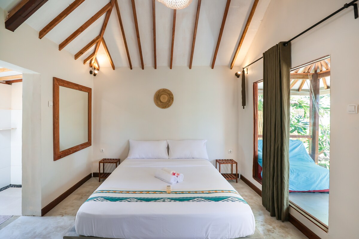 This cozy bungalow with AC is just a 5-minute walk from the beach, perfectly located beside the local football field and market. Perfect to mingle with island residents and even join a friendly BBQ next door. Simple, clean, and comfortable — it’s an authentic Gili Trawangan experience with a local touch.