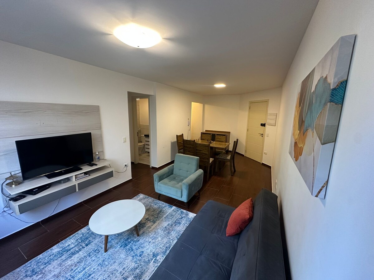 Stylish 50 mยฒ apt. located at Bela Vista, has 24hr doorman. 2 bedrooms (only 1 with AC, and queen bed, the second one is quite small and can be used as an office, fitting a double-sized sofa-bed) and 1 bathroom. With amazing views from every window, it is a great place to work and relax. The private jet-tube at the balcony is a fantastic spot to enjoy the city views. Ideal for couples, professionals or small families looking for comfort, convenience, and one of the best views in the city.