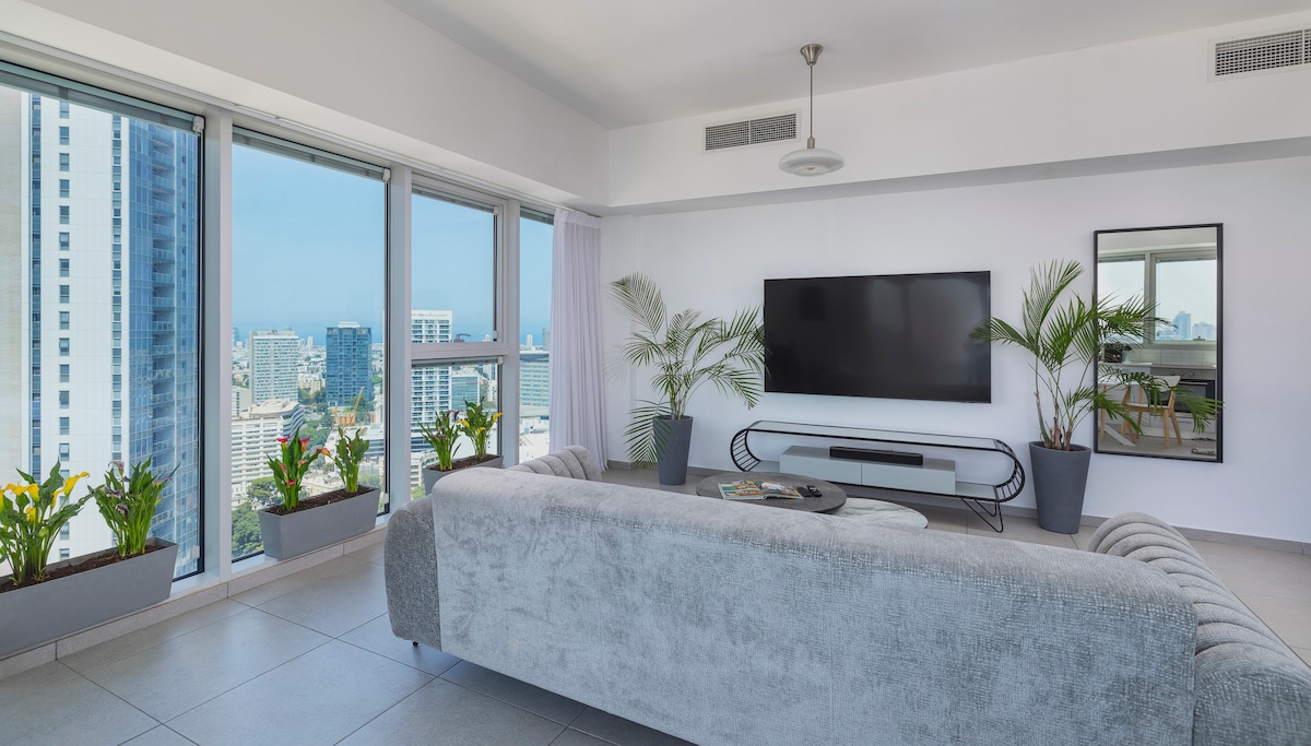 ♚ Welcome to our luxury 2-bedroom apartment ♚ on the 30st floor of Midtown Tower, Tel Aviv's iconic landmark. Enjoy of breathtaking city and sea views, mesmerizing sunsets that paint the skyline. Prime Location apt, 5 min walk from Azrieli Mall, Sharona Market, the Train Station and public transportation everywhere!, a 15 min walk from Rothschild Blvd. Enjoy free access to an equipped gym and pool and 24/7 security. One of our bedrooms is a secure room (Mamad) ☑ Make yourself at home ♡
