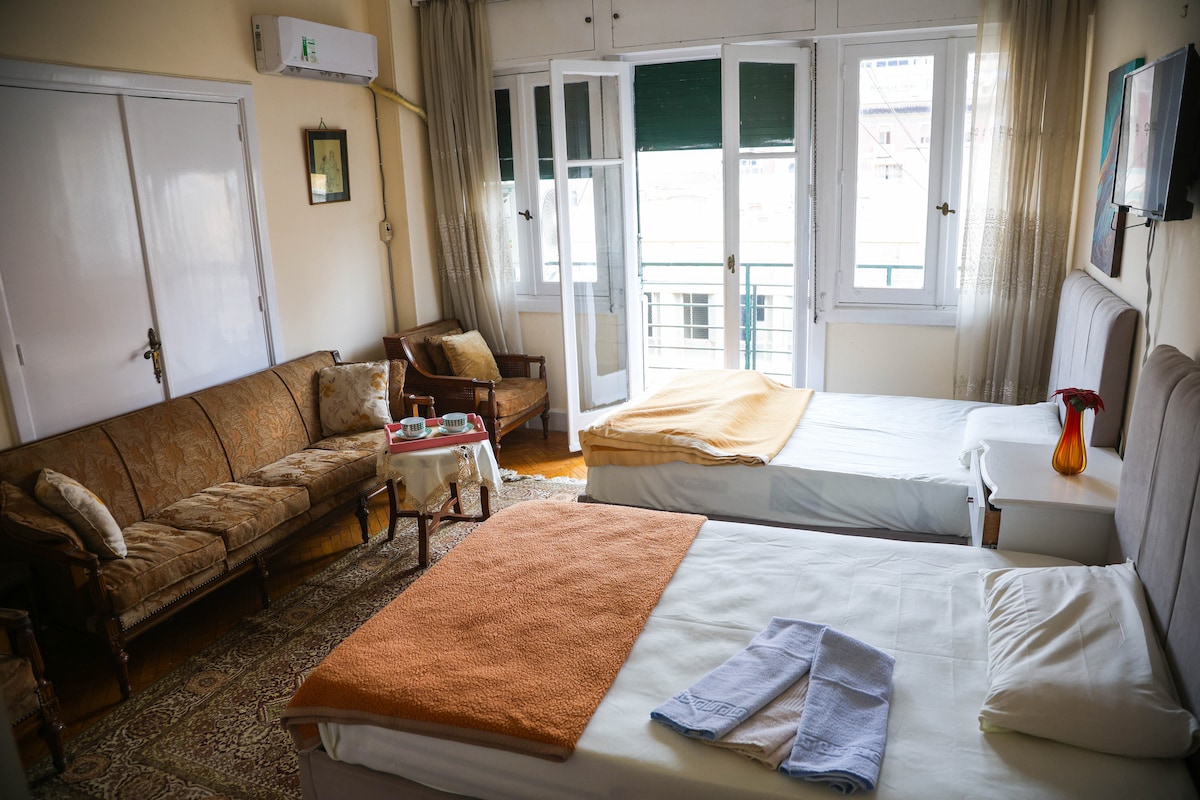 아늑한 침대 2개, 푹신한 소파, 매력적인 의자 2개가 갖춰진 넓은 객실에서 편안함과 우아함을 경험해보세요. 에어컨, 초고속 와이파이, 평면 TV, 선풍기를 즐겨보세요. 전용 발코니로 나가 카이로 시내의 활기찬 풍경과 소리에 흠뻑 빠져보세요. 귀중한 가구를 갖춘 빈티지 다이닝룸과 거실에서 즐거운 시간을 보내고, 시설이 완비된 주방에서 요리를 즐겨보세요. 카이로를 둘러보기에 완벽한 숙소가 기다리고 있습니다. 지금 예약하시고 잊지 못할 추억을 만들어가세요!