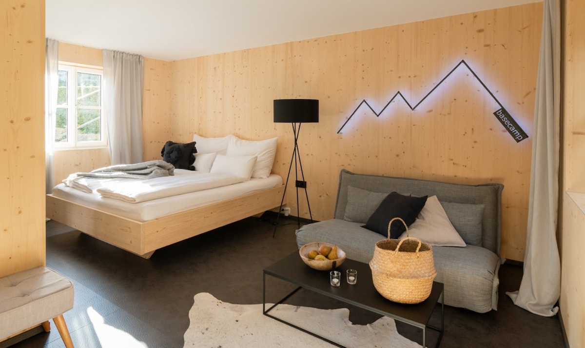 개울 소음과 새 지저귀는 소리와 함께 휴식을 취하기 좋은 숙소입니다. 차는 차고 바로 옆에 주차할 수 있으며, 별도의 출입구는 노출된 옥상 의자가 있는 아늑한 거실로 이어집니다. 객실에는 풀아웃 소파 베드가 놓인 TV 코너, 4인용 식사 공간, 시설이 완비된 푸스볼 테이블이 있습니다. 바닥에서 천장까지 이어지는 발코니 문을 열면 공간에 빛이 많이 들어오고, 라다우바흐 바로 앞에 그림 같은 일몰 발코니가 있습니다.