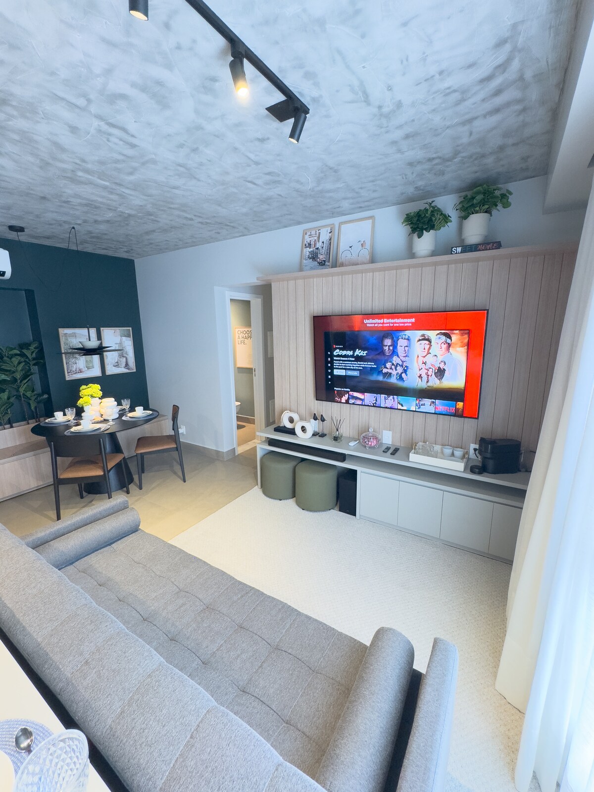 • Decorated and modern • High floor • 2 suites • Half-bath • Living and dining area • Fully equipped kitchen • Balcony and laundry area • 65” TV with home theater • Games • Air conditioning • Internet • Appliances • Complete bedding set • 24-hour front desk • Concierge • 2 tandem parking spaces • Full amenities: pool, squash court, pet area, gym, playground, gourmet lounges, sauna, coworking space • Prime location; Less than 10 minutes from malls, hospitals, markets, and tourist attractions
