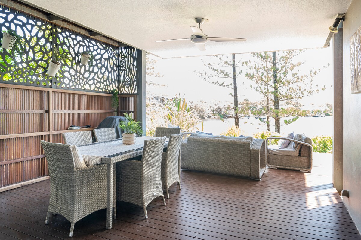 Defined by its blend of muted colours and geometric decor pieces, this subdued apartment has a streamlined style that fosters a climate of calm. A covered deck patio invites the ideal space to host a barbeque, complete with lake views. Direct lagoon water views and ground floor access make this a dream holiday destination. You can't help but relax! Ground floor apartment with your own private garden and deck with direct walking access to the resort restaurants and bar, lagoon, pool, surf beach and river. Access the resort facilities with free water sports (kayaking, water trampoline and sailing boats) and a paid water activity park perfect for the kids (and big kids too!). An 18 hole Golf course runs through the resort. This is a perfect Sunshine Coast getaway for the whole family. All linen and towels are provided. Sit on the deck and watch the world go by. The Sunshine Coast airport is a few minutes drive, Sunshine Plaza is a 15 minute drive, there are however local shops for provisions. Any questions before or while you are staying, please text, call or you can message via AirBnB. Contact details are all provided in the information pack on arrival. Set within Twin Waters Resort, the apartment is set beside the Maroochy River. It's steps away from a golf course and a beach, as well as a conservation area. Restaurants and nightlife in town are a short drive away. Full access to resort facilities may be subject to COVID restrictions. Great ideas for things to do in the area: Eumundi Markets Marcoola Eat Street Friday nights Noosa is half hour drive away Restaurants recommended outside of the resort: High Tide Cafe The Loose Goose Bulli Cafe at Marcoola Set within Twin Waters Resort, the apartment is set beside the Maroochy River. It's steps away from a golf course and a beach, as well as a conservation area. Restaurants and nightlife in town are a short drive away. Full access to resort facilities.