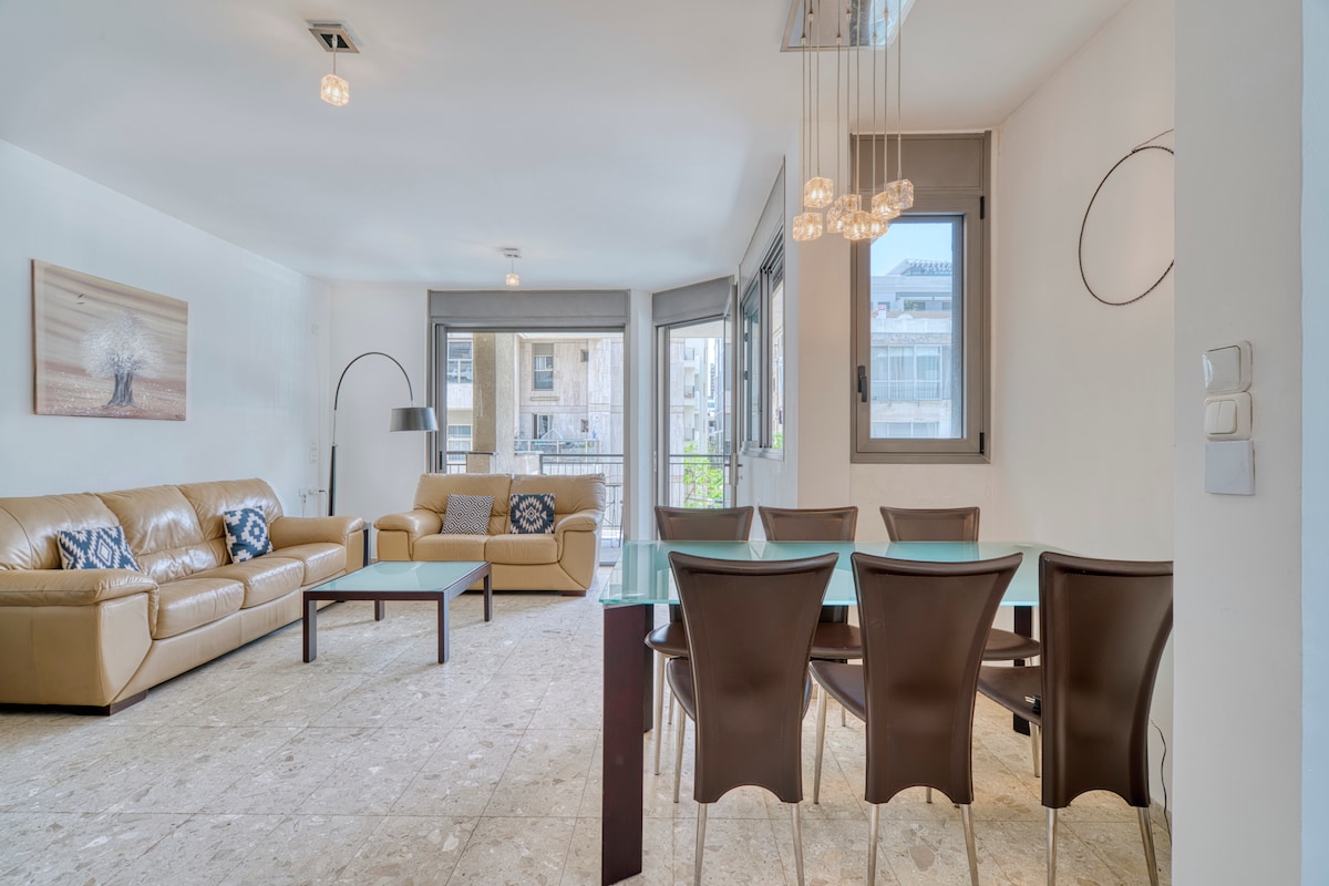 Enjoy a stylish experience at this centrally-located place. Brand new and well designed apartment in Bugrashov st. number 62. 2 Bedrooms and very spacious living room. 65 inch TV and designed dinner table. Brand new fully equipped kitchen and bran new shower & bathroom. Perfect stay for young families or small groups!