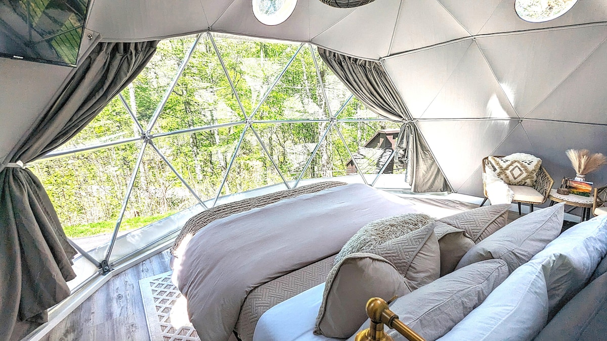 산에 간다면 그냥 숙소를 찾는 것만으로는 부족합니다. 스모키 산맥이 내려다보이는 독특하고 낭만적인 지오데식 돔에서 럭셔리한 캠핑을 즐기고 평생 기억에 남을 추억을 만드세요. 산과 나무로 둘러싸인 4.5에이커에⭐️ 위치하고 있습니다. 다음과 같은 시설이⭐️ 갖춰져 있습니다. 온수 욕조 야외 화로(스모어용 간식 포함) 실내 벽난로 2인용 전용 하이킹 트레일 더욱 멋진 해먹 산 전망.