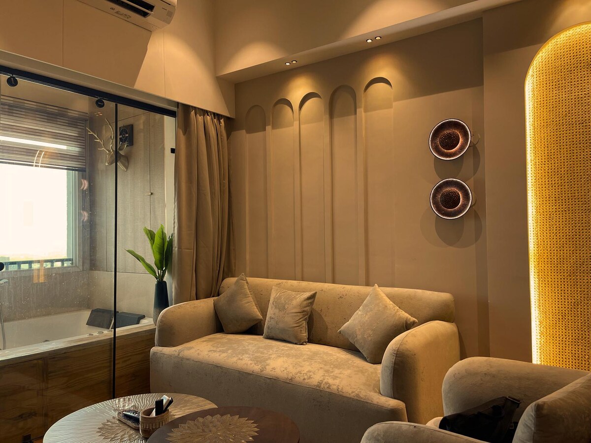 Introducing our exquisite luxury studio apartment: Nestled in the heart of the city, this opulent studio boasts modern elegance and unparalleled comfort. The open-concept design invites you into a spacious haven, bathed in natural light from the large windows that offer breathtaking city views. This apartment is on the 41st floor in one of the tallest sky scraper in Delhi - NCR. The apartment has a river facing view from the balcony!!