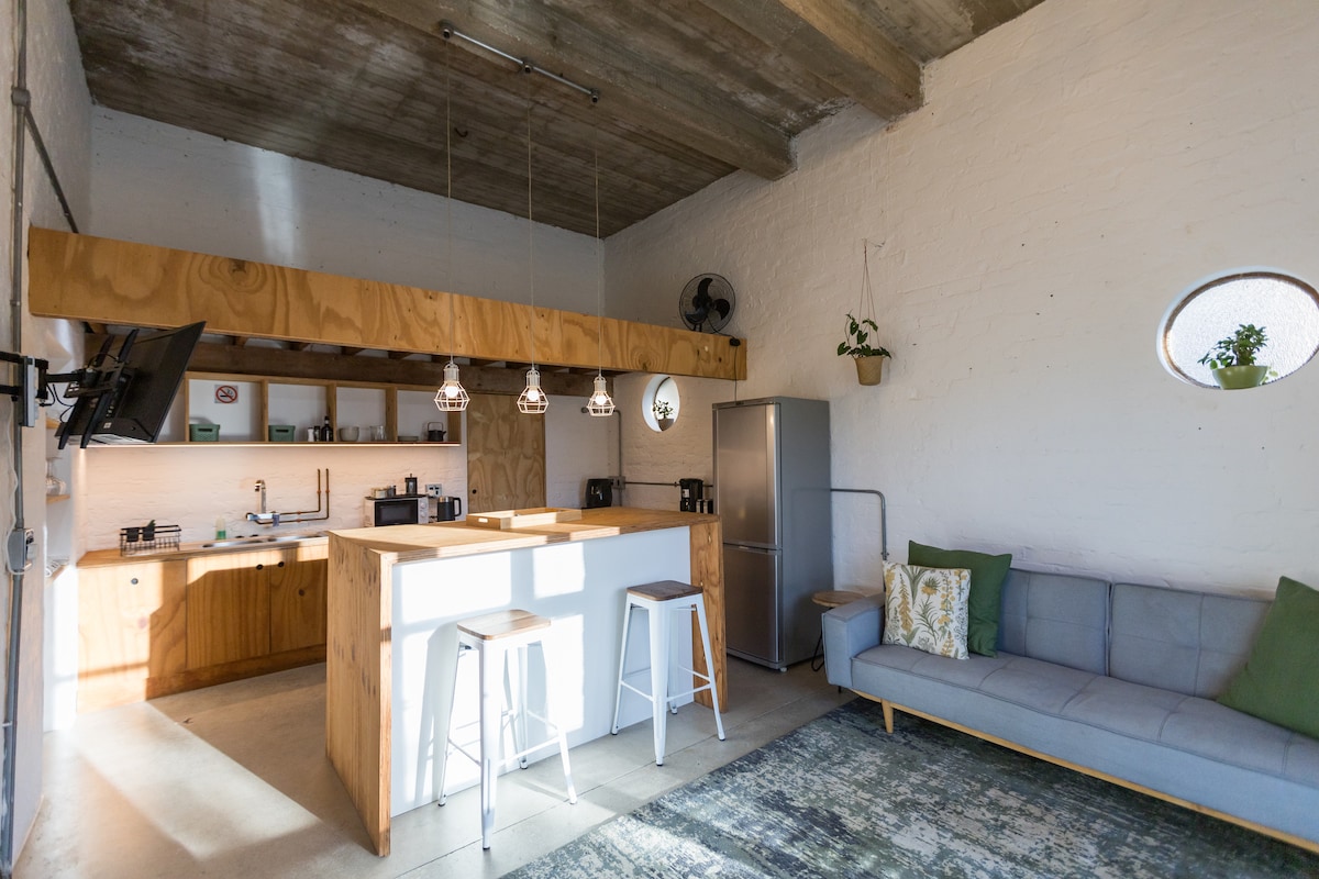 Ideal for short stays. Secure off-street parking. Convenient position - 5 mins from Airport, St George's Park, Grey schools. 7 mins to Beachfront. 35 mins to Addo Elephant Park. Located in the garden of a family home and the owner's art studio. Full en-suite bathroom the kitchenette has a kettle, microwave and fridge. Queen double bed, free Wifi, solar electricity and independent water supply. Cafés, shopping centre within 5 minutes walking distance.