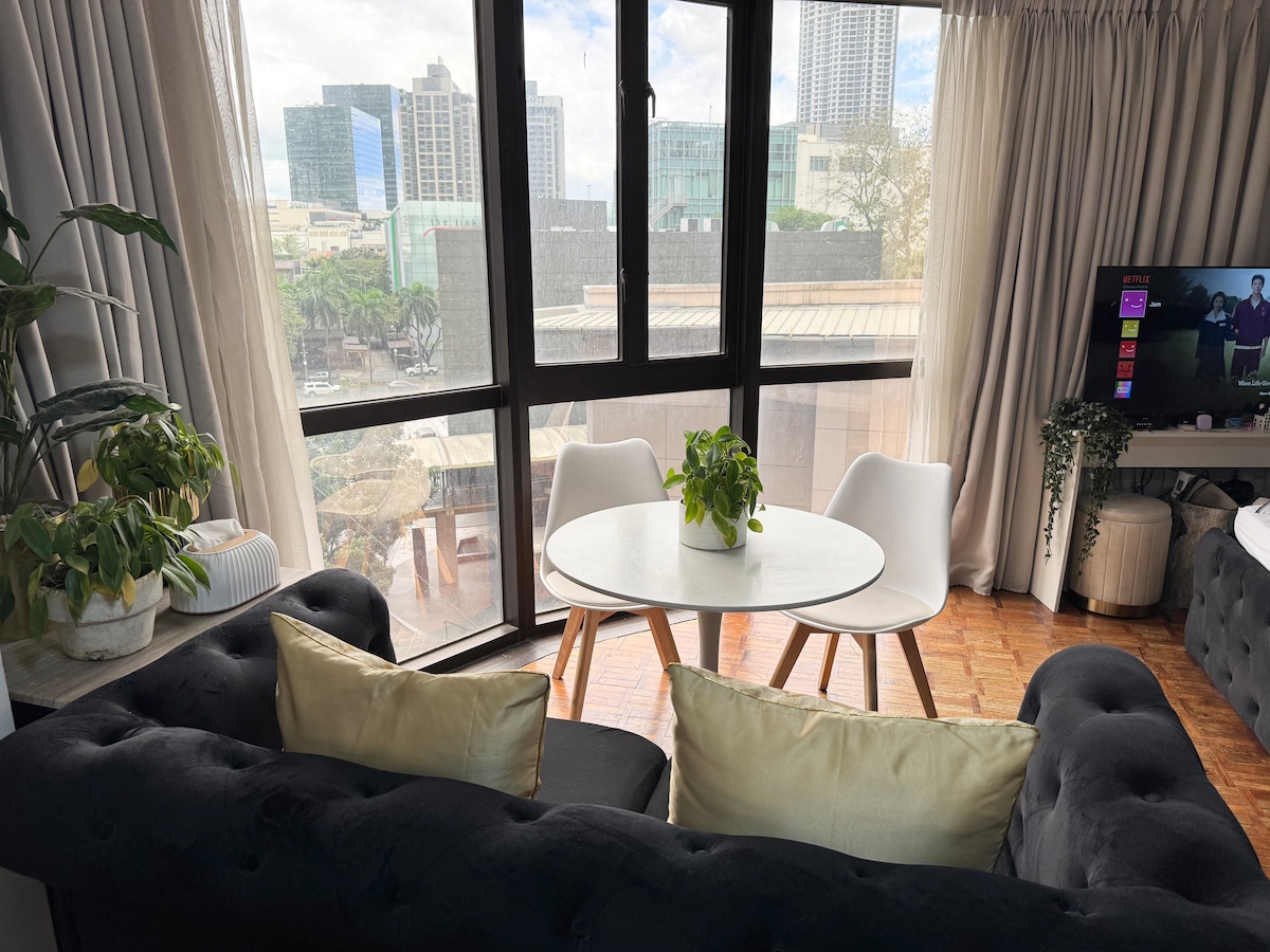 Stylish Bauhaus-inspired and just renovated 54sqm loft on the 28th floor of Mosaic Tower, just steps from Greenbelt and Legazpi Park. High ceilings, bold accents, a queen bed plus two sofa beds, two LG Smart TVs, full kitchen, and 50 Mbps WiFi make it perfect for work or play. Relax on the south-facing balcony with leafy views. Building perks include pool, gym, 24/7 security, and lobby reception—your Makati escape awaits!
