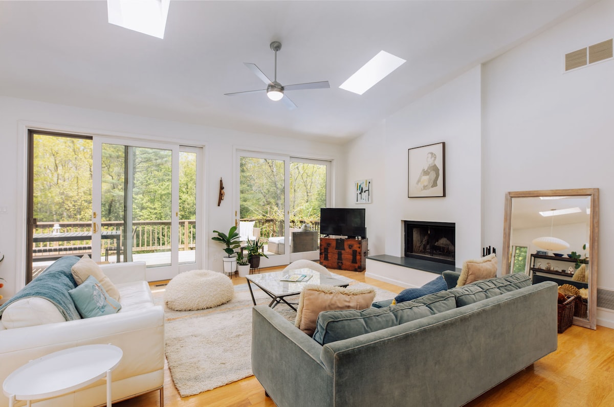 Perched on a hill with a rare Catskill Mountain view, our home is your perfect nature escape. Designed for relaxation, creativity, and fun, it’s ideal for hiking, swimming, skiing, and exploring. Just a short drive to Catskill, Hudson, Woodstock, and other lively towns. Stocked with instruments, toys, books, games, and a ping-pong table, it’s perfect for families and friends. Enjoy the magical 50 ft. pool during the Summer or soak in the hot tub all year-round, you're in for a magical stay!