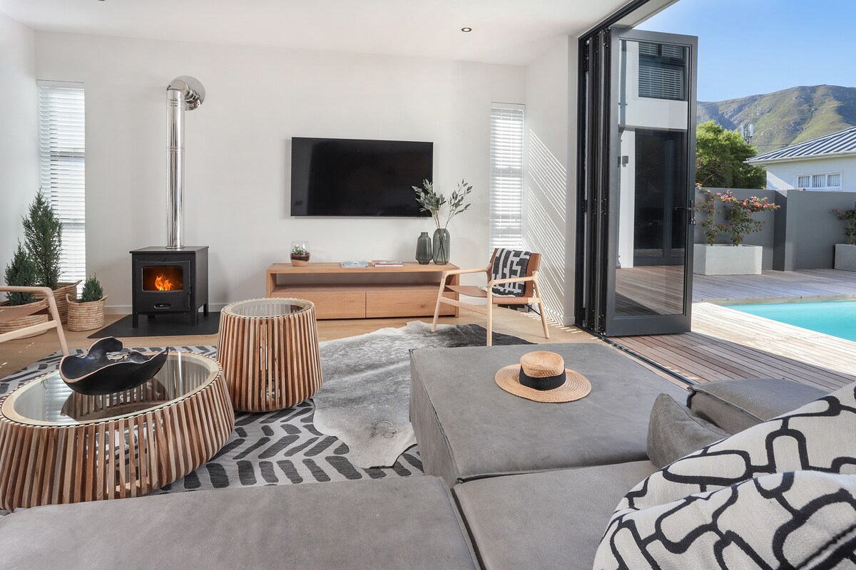 This stylish 5 bedroom, 5 en-suite bathroom beach bungalow provides the ideal setting for a relaxed vacation at the majestic Hermanus coast. While away the hours pool-side, or enjoy the mountain glow at sun-set around the fire-pit with loved ones. Just a short walk to the beach, The Bungalow is what holiday dreams are made of. Enjoy the fire-place & local wine-farms in the winter, or enjoy the outdoor chill areas in the summer-time. Hello poolside barbecues! Solar-powered ☀️