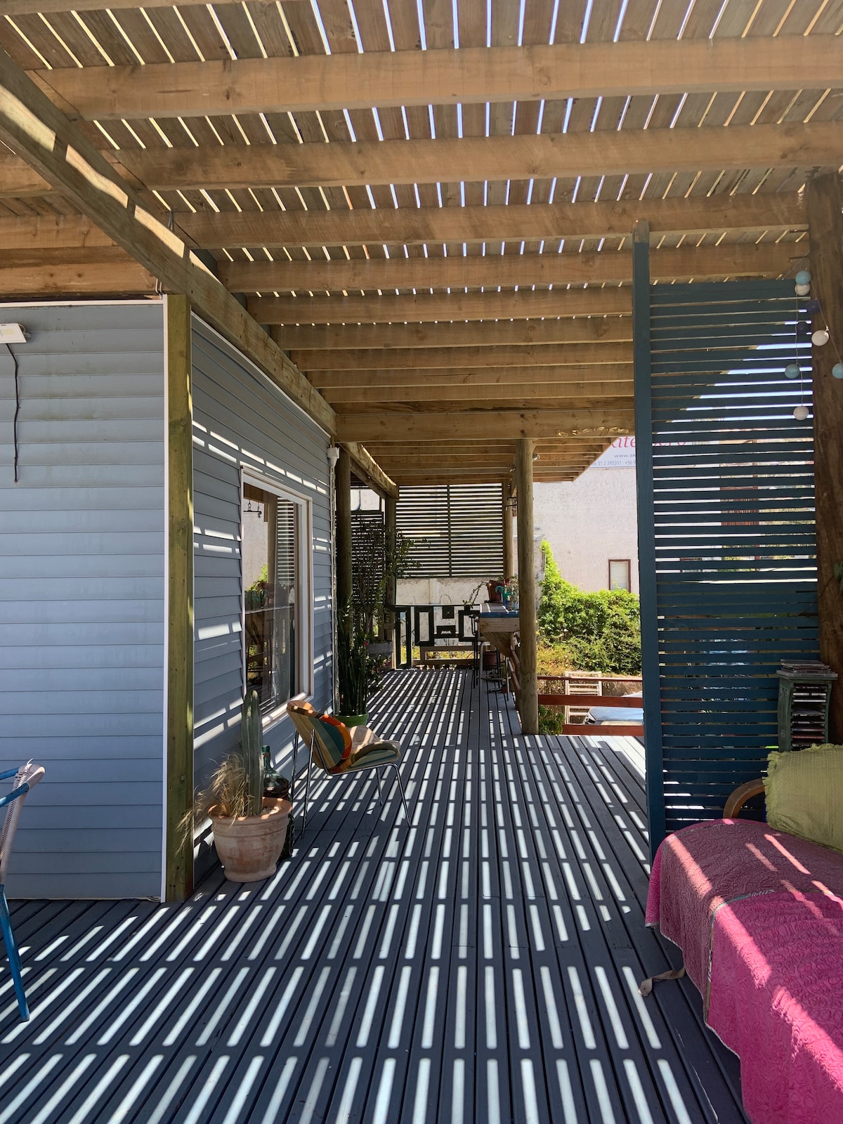 Cozy and comfortable wooden cabin with 1 bedroom with double bed, bathroom, living-dining room-kitchen and large roofed terrace around the front of the house. Perfect accommodation for those traveling alone or as a couple. Ask about our discounts for stays longer than a week. Enjoy the 6×2m covered terrace surrounded by nature. Located in an ecological plot where birds sing and nature sets the pace—perfect for a peaceful retreat.