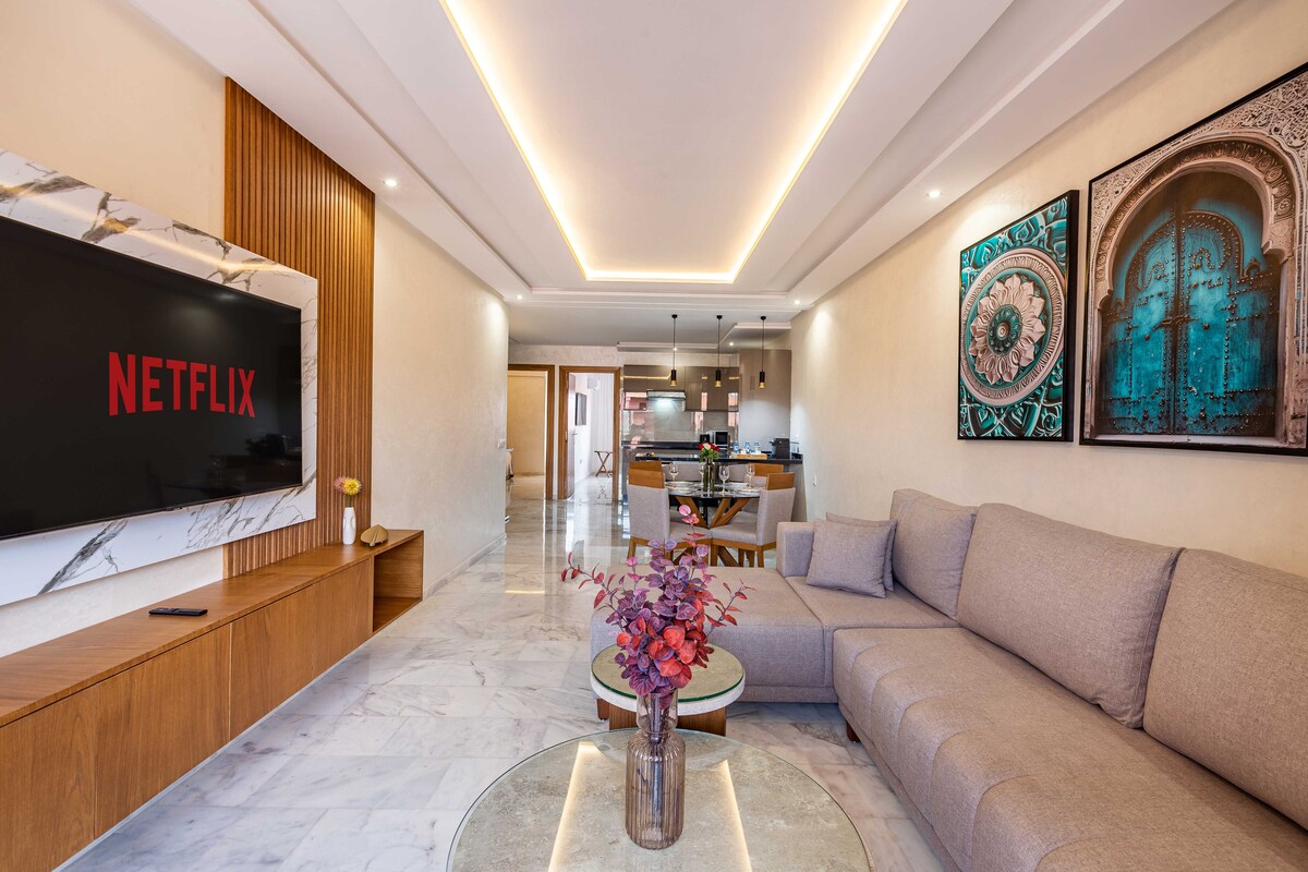 도시 최고의 명소를 도보로 쉽게 이동할 수 있는 겔리즈 중심부에 위치한 보헤미안 스타일의 현대적인 아파트를 만나보세요. 주방 시설, 환영 선물, 침구 및 수건 포함. 넷플릭스, 광섬유, 다양한 채널을 볼 수 있는 IboTV 플레이어가 있는 거실. 키네도르살 침구와 넉넉한 수납 공간이 있는 편안한 객실. 그네가 있는 넓은 테라스를 즐겨보세요. 진정한 마라케시를 경험하기에 완벽하고 편안합니다. 추신: 미혼 모로코 커플은 허용되지 않습니다.