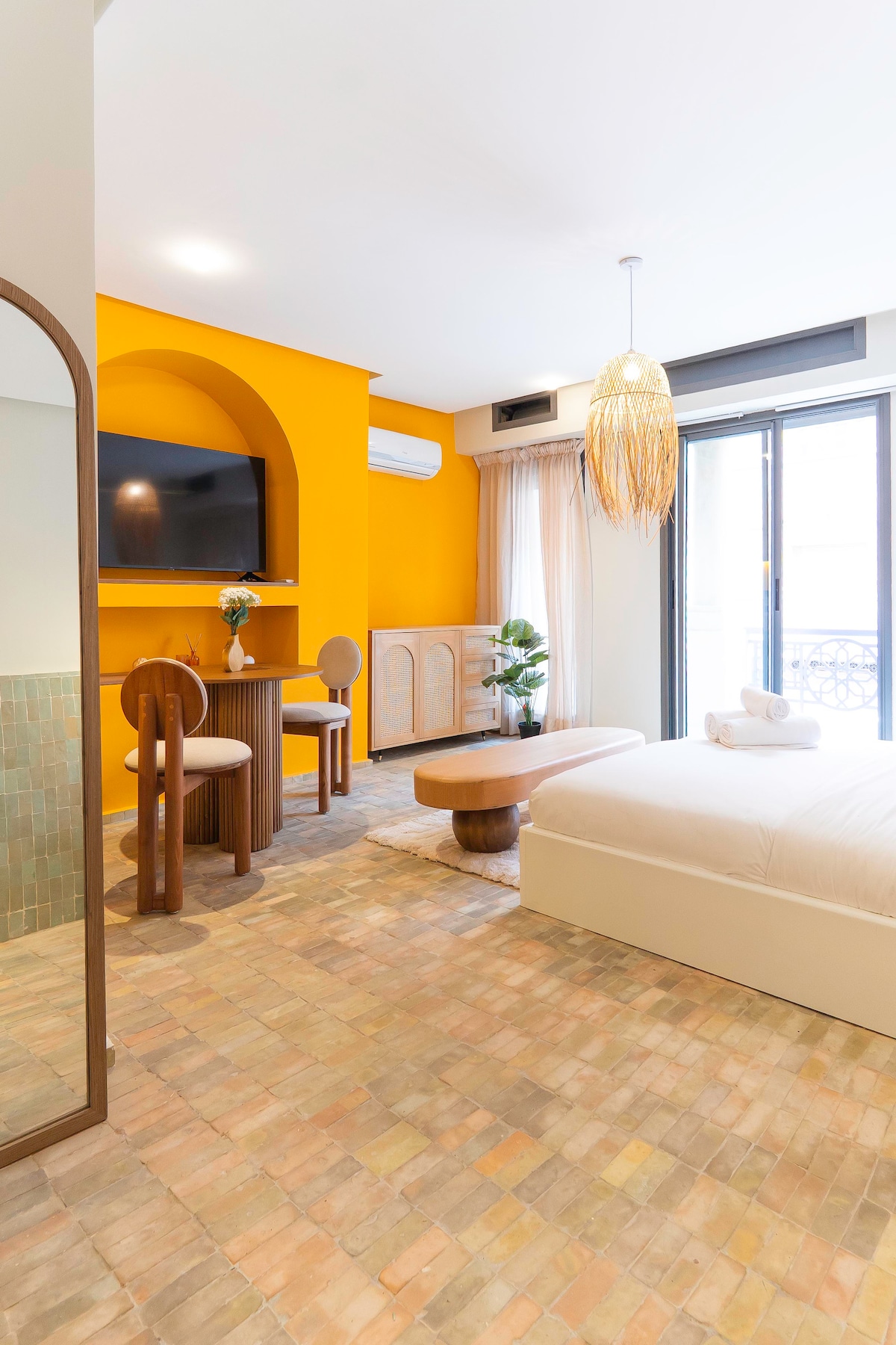 Studio chic aux tons solaires, situé en plein centre de Guéliz. Design moderne et ambiance chaleureuse. Le studio est entièrement équipé avec TV, climatisation et petite cuisine fonctionnelle. À 7 minutes de la place Jemaa El Fna et 13 minutes de l’aéroport Marrakech-Menara. Restaurants, cafés et commerces à proximité. Idéal pour un séjour confortable à Marrakech.