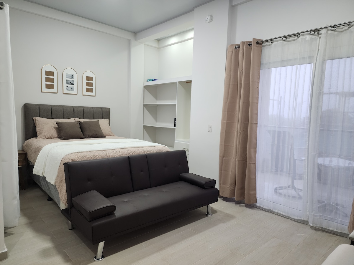 Diseño elegante, a/c; cerca de atracciones, restaurantes, hospitales y tiendas. Alojamiento privado, seguro, - Sala con baño social, sofá cama y smart TV - 1 habitación con litera Queen, baño dentro de la habitación - Barra desayunadora para disfrutar tu comida de Delibery, refrigerador bar (Debes de encenderlo al llegar ) microondas Especial esmero en la limpieza. Te ofrezco papel higiénico, jabón para cuerpo,shampoo, acondicionador Parqueo (Externo) Escritorio portátil con rodos