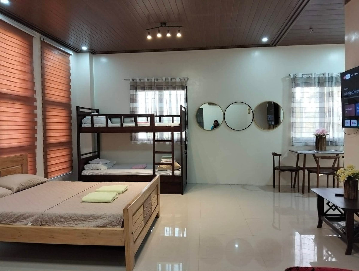 1. Airconditioned studio room with complete bedlinens, pillows and bath towels 2. Your own roofdeck with view and bar set up 3. Free drinking water 4. Free use of kettle 5. Free shampoo 6. Free use of flat iron for clothes 7. Your own bathroom with shower head and bidet 8. 1 cleopatra can use as a bed 9. Extra Family size foam 10. 42 inches smart tv 11. Free Netflix 12. Free unlimited Wifi 13. Free motorbike parking 14. Free Car parking 15. Rent A Car Available with driver