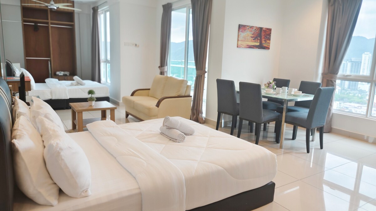 유명한 구르니 드라이브에 위치하고 있으며 바투 페링히 북쪽 해변 근처에 있습니다. 거니 파라곤/구르니 플라자 쇼핑몰에서 쇼핑을 즐기고 거니 드라이브 호커 센터, 다양한 레스토랑/비스트로에서 현지 음식을 즐겨보세요. 모두 도보 거리 내에 있습니다. 글레나글스 메디컬 센터, 페낭 어드벤티스트 병원, 페낭 아일랜드 병원도 차로 단 몇 분 거리에 있습니다. ★ 살균 및 소독 완료 ★