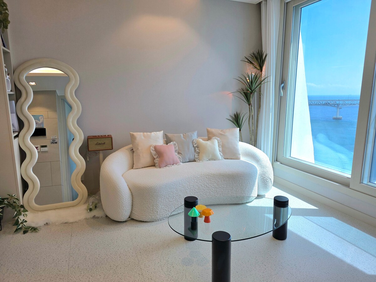 로즈 스테이입니다~ 광안대교 파노라마뷰와 아름다운 야경이 당신을 힐링하게할 감성숙소 드림 에이스 광안입니다 곡선 디자인의 포근한 소파와 미니 테이블이 조화를 이루는 감성적인 거실 공간은 창문 너머로 광안대교와 바다가 한눈에 들어오는 오션뷰가 펼쳐져 있어, 여유로운 휴식과 낭만적인 시간을 보내기에 완벽한 장소입니다. TV와 빔프로젝터에서는 다양한 무드의 플레이리스트와 영상 콘텐츠를 감상하실 수 있어 더욱 편안한 여행을 즐기실 수 있습니다. 푸른바다와 아름다운야경, 편안한 인테리어, 멋진 오션뷰파노라마가 펼쳐지는 감성휴식처 드림에이스광안에서 특별한하루를 약속합니다 감탄사가 절로 나오는 오션뷰, 시티뷰,광안대교뷰를 마음껏 누려보세요~~