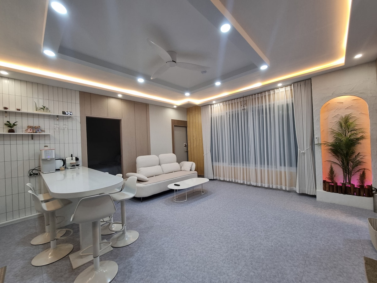 울산공항 차로 5분 거리 신도시 송정지구에 있는 숙소입니다. 울산시내, 경주, 바닷가 모두 차로 20분 ~ 30분 소요되는 곳에 있어 모두 즐기고 싶으신 분들께 적합합니다. 저희 숙소는 천장이 높고 깨끗하며 면적이 86.68m2(26.26평)으로 넓은 집입니다. 신축 건물로 모든 제품들을 새 제품으로 구비해 두었습니다. 숙소의 뒤로 나가시면 테라스가 있어 아이들이 뛰어놀 수 있고 바깥 바람을 맞으며 앉아있을 수 있는 공간이 있습니다. 근교에는 박상진 생가를 비롯해 박상진 호수공원이 있어 가족들과 산책과 관광을 하기에도 적합합니다.