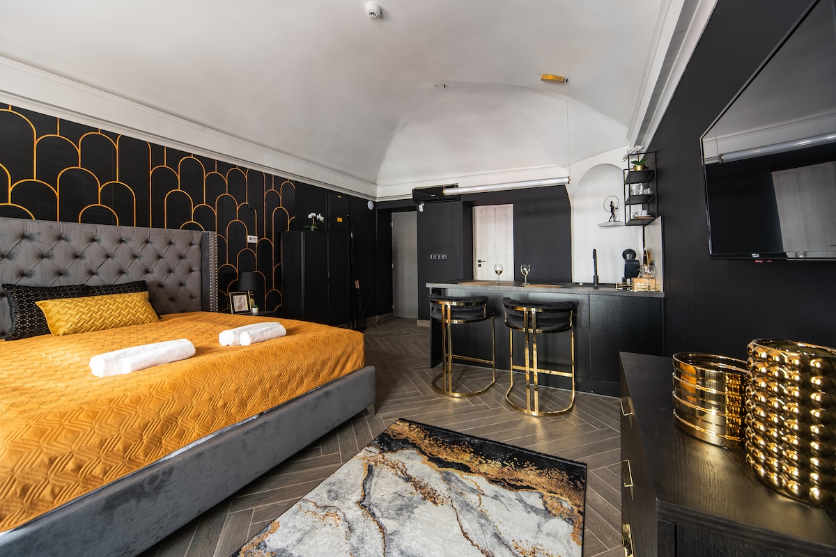 This luxury apartment in the heart of Győr is located in a fully renovated building consisting of 15 rental units, each of them one-of-a-kind with its own unique design. This one was inspired by Boutique style interior design, which is reflected in the materials, colors and patterns used. Whether you're coming to explore the city or just passing through, this place near the main square and the Danube is the perfect choice and has all the amenities you might need for a short stay.