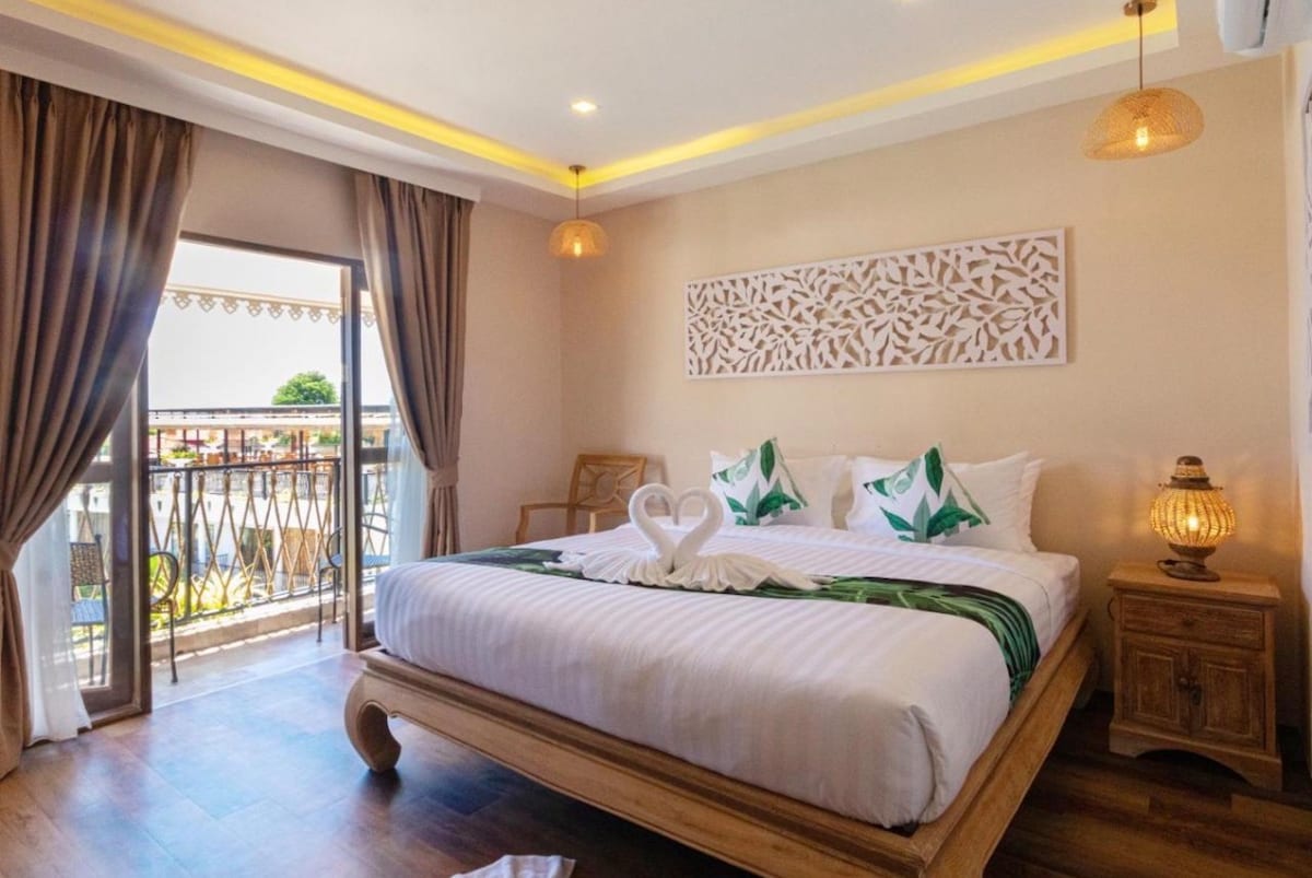 ห้องพักสไตล์บาหลีโคซี่ โดดเด่นด้วยประตูและหน้าต่างทรงโค้งไม้ ให้ความรู้สึกอบอุ่น เป็นส่วนตัว และผ่อนคลาย ตกแต่งด้วยวัสดุไม้แท้ โทนสีธรรมชาติ และแสงไฟวอร์มไลต์ สร้างบรรยากาศเหมาะสำหรับการพักผ่อนอย่างแท้จริง ภายในห้องมีเตียงนอนขนาดใหญ่ ผ้าม่านสีเขียวเข้มสไตล์รีสอร์ต โต๊ะทำงาน/โต๊ะเครื่องแป้ง ทีวี และห้องน้ำในตัว เหมาะสำหรับคู่รัก นักเดินทาง หรือผู้ที่ต้องการพักผ่อนแบบสงบ ๆ ใกล้ Fisherman’s Village เกาะสมุย