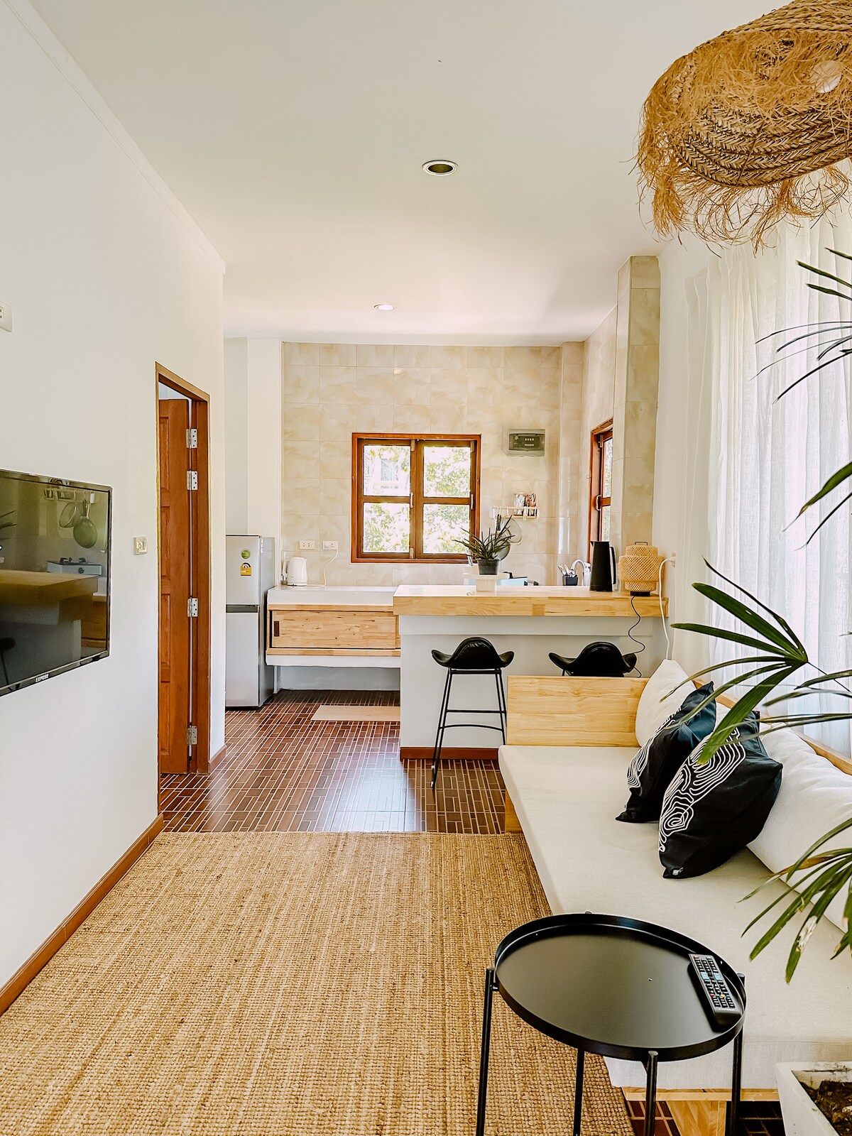 A cozy home in a quiet area of Haad Yao, just a few minutes’ walk from the beach, cafés, and restaurants. A bright bedroom with air conditioning and the pleasant sound of birds in the morning creates a peaceful and relaxing atmosphere. The living room is combined with the kitchen and features a wall-mounted TV and a comfortable seating area. The kitchen is fully equipped, and the large table is perfect for working on a laptop. A small balcony with a sunset view, quiet neighbors, and parking.