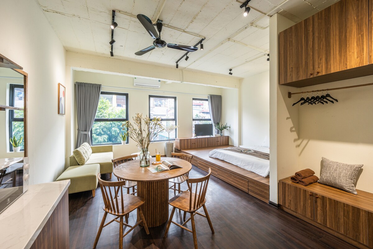 하노이의 중심부에 위치한 작은 발코니가 있는 침대 2개 아파트입니다. 오페라하우스까지 1분, 호안끼엠 호수까지 5분, 올드 쿼터까지 도보로 10분 거리에 있습니다. 엘리베이터가 있는 새 건물의 높은 층에 있는 아파트입니다. 침실 전체, 퀸사이즈 침대 2개, 소파 베드, 주방, 스타일 가구가 있는 욕실이 있습니다. SaziHome 연중무휴 셀프 서비스. * 매일 무료 수건 교체 (요청 시)