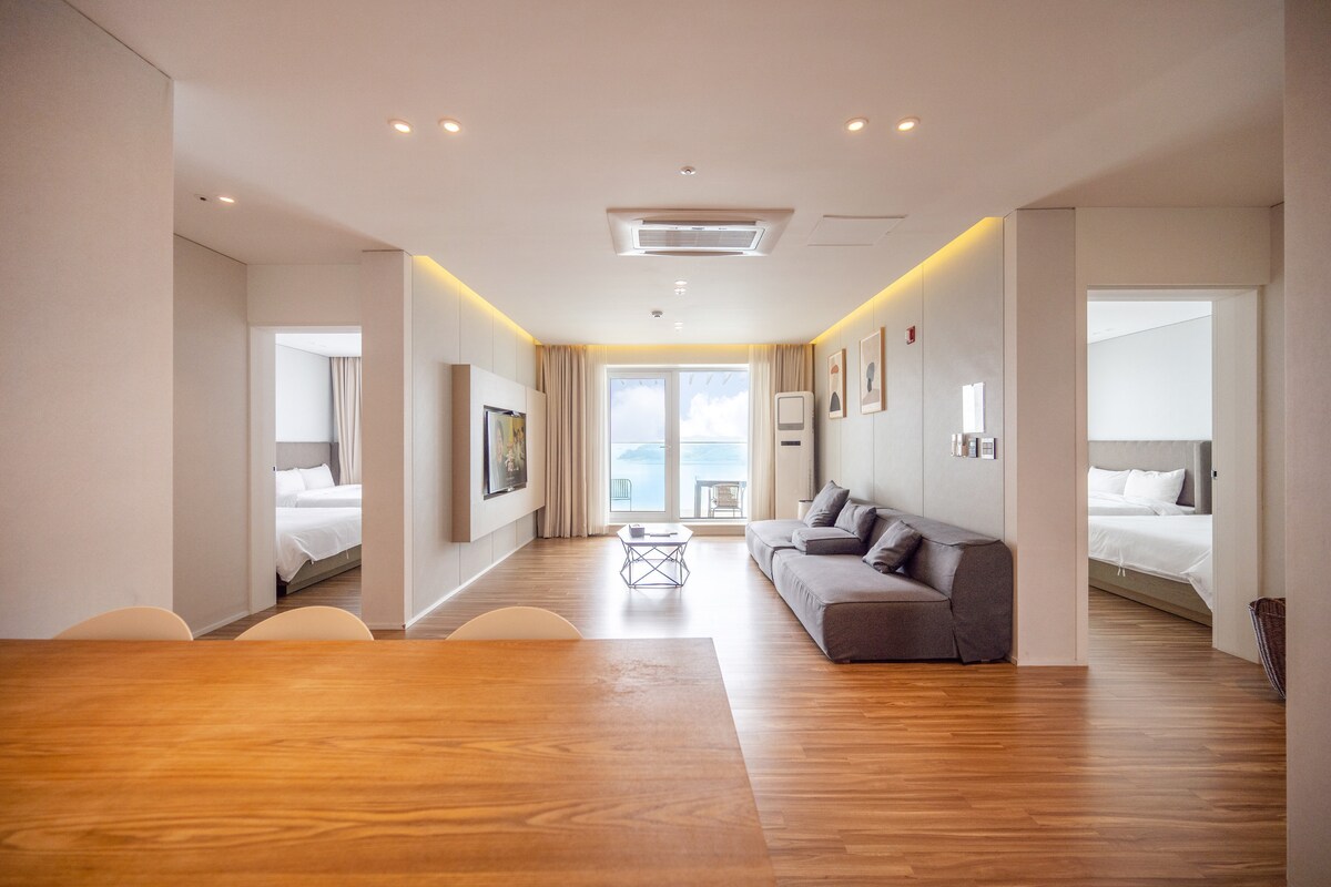 마리나항만이 내려다 보이는 고급 레지던스에서 여수를 만끽해보세요. 여수의 마린시티 웅천동에 위치하여 두산에너빌리티에서 신축한 트리마제 레지던스입니다. 넓은 지하주차장(지하1.2층)과 시스템 에어컨.세탁기.건조기.빌트인 냉장고.김치냉장고.전기오븐.비데 등의 가전이 풀옵션 완비되어 있습니다. 메인방에는 드레스룸과 화장대가 있어 보다 쾌적한 객실 사용이 가능하며 TV(넷플릭스.유튜브 시청가능), 전기포트, 커피메이커(커피원두.차 제공), CD&블루투스 오디오,드라이기를 제공하고 있습니다. 넓은 주방에서 호스트가 제공하는 각종 조미료와 조리도구로 쉽고 편리하게 요리를 하실수 있습니다. 침구는 매일 새롭게 교체됩니다. 메인방에 침대(Q) 1개, 방2에 토퍼(Q)를 깔수 있어 4명 투숙이 가능하며 그 이상의 인원은 미리 문의 바랍니다. (기본 2인 투숙, 1인당 추가비용 15.000)