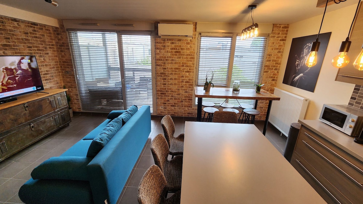 Rooftop unique avec vue 180° mont-Blanc & Lyon, terrasse 50m² complètement équipée, climatisation, 2 chambres, 2 TV, 2 salles de bain, TV, wifi fibre, bureau équipé dualscreen 67cm, décoration soignée, parking sécurisé et accés centre ville et gare de Perrache à 2 arrêts de bus.