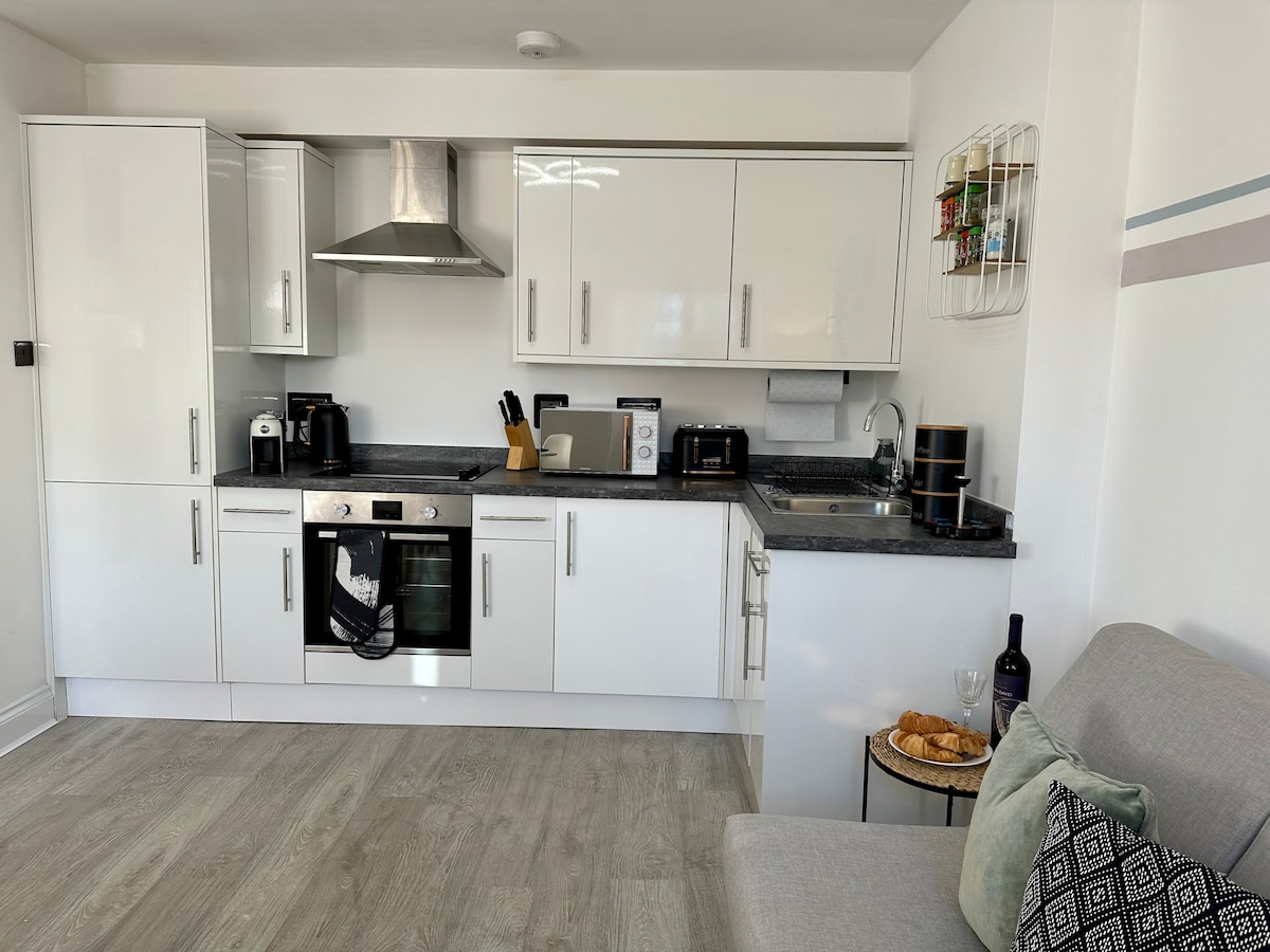 시대적인 특징을 갖춘 넓은 플랫. 소파 2개가 있는 사랑스러운 라운지 공간, 바다 전망의 베이 윈도우. 55인치 스카이 글래스 TV, 뒤쪽 정원이 조용한 대형 침실. 더블 침대와 매트리스가 갖춰진 접이식 침대 1개 사용 가능. 욕조 위에 전동 샤워기가 있는 욕실. 밝은 주방에는 더블 도어가 있어 높은 파티오 공간으로 이어지며, 아침 커피를 마시기에 안성맞춤이며 넓은 전용 정원으로 내려갈 수 있습니다. 숙소 외부 노상 주차를 위한 주차 허가증 제공