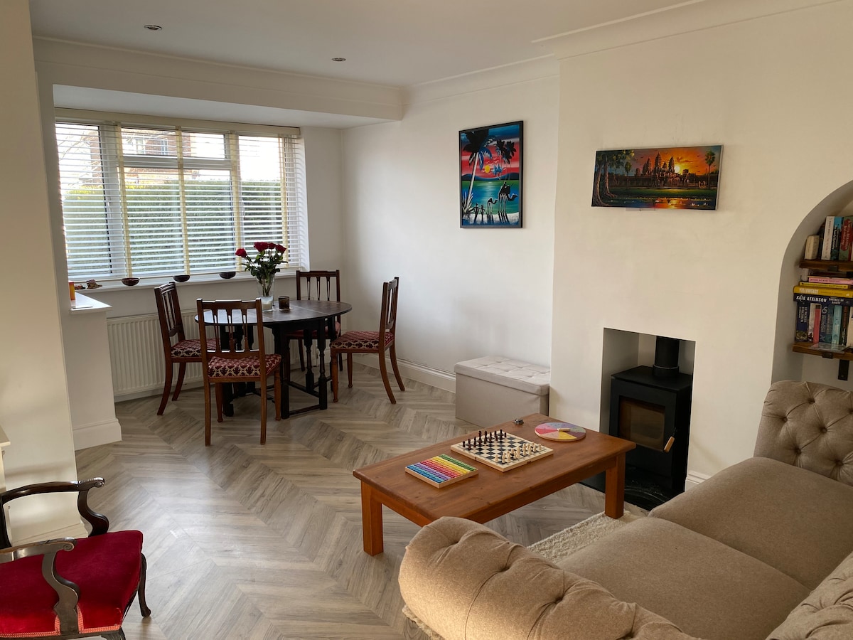 햄프턴 코트 근처에 있는 사랑스럽고 평화로운 가족 숙소에서 휴식을 취하세요. 소파에 앉아 게임을 즐기거나, 쌀쌀한 저녁에는 TV 앞에서 휴식을 취해보세요. 따뜻한 날에는 와인 한 병을 들고 정원으로 나가 바쁜 하루를 보낸 후 휴식을 취해보세요. 바로 길 건너편에 놀이터, 야외 체육관, 농구/테니스 코트가 있습니다. 몰시 히스 자연보호구역, 템스강, 레스토랑, 상점, 햄프턴 코트 궁전까지 도보 거리.
