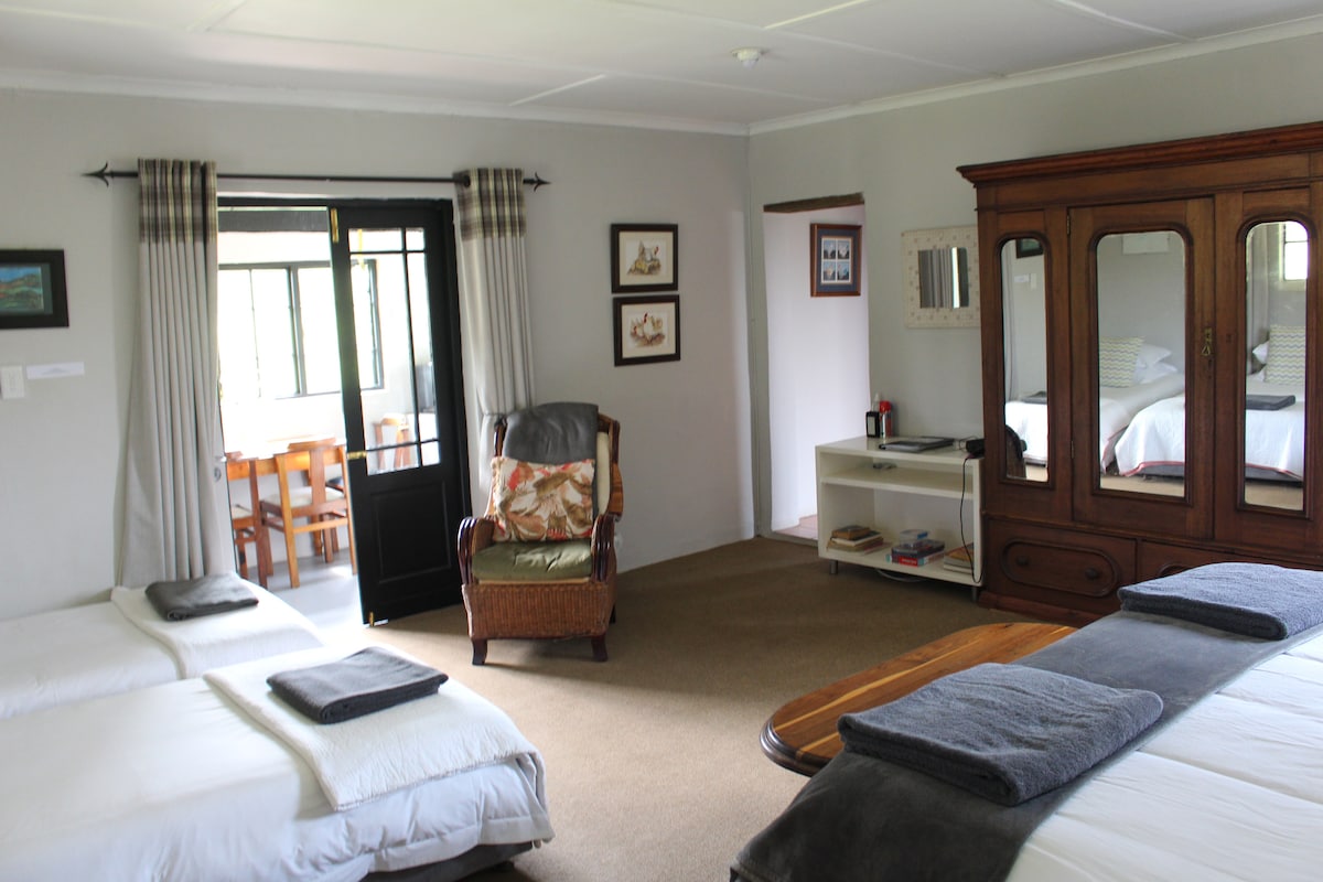 Enjoy peaceful but sophisticated living on a tranquil working farm with cattle, sheep, chickens and ducks. Walk in the indigenous forests, run, ride bikes, paddle our kayaks on the dam or just sit next to your fireplace and relax. Entire four en-suite bedroom home with ample living and entertaining spaces for exclusive use. A lovely family stay venue. Price is for 4 people. Additional guests charged extra. Maximum 8 guests allowed. NB Large duck pond 20 M from the Farmhouse.