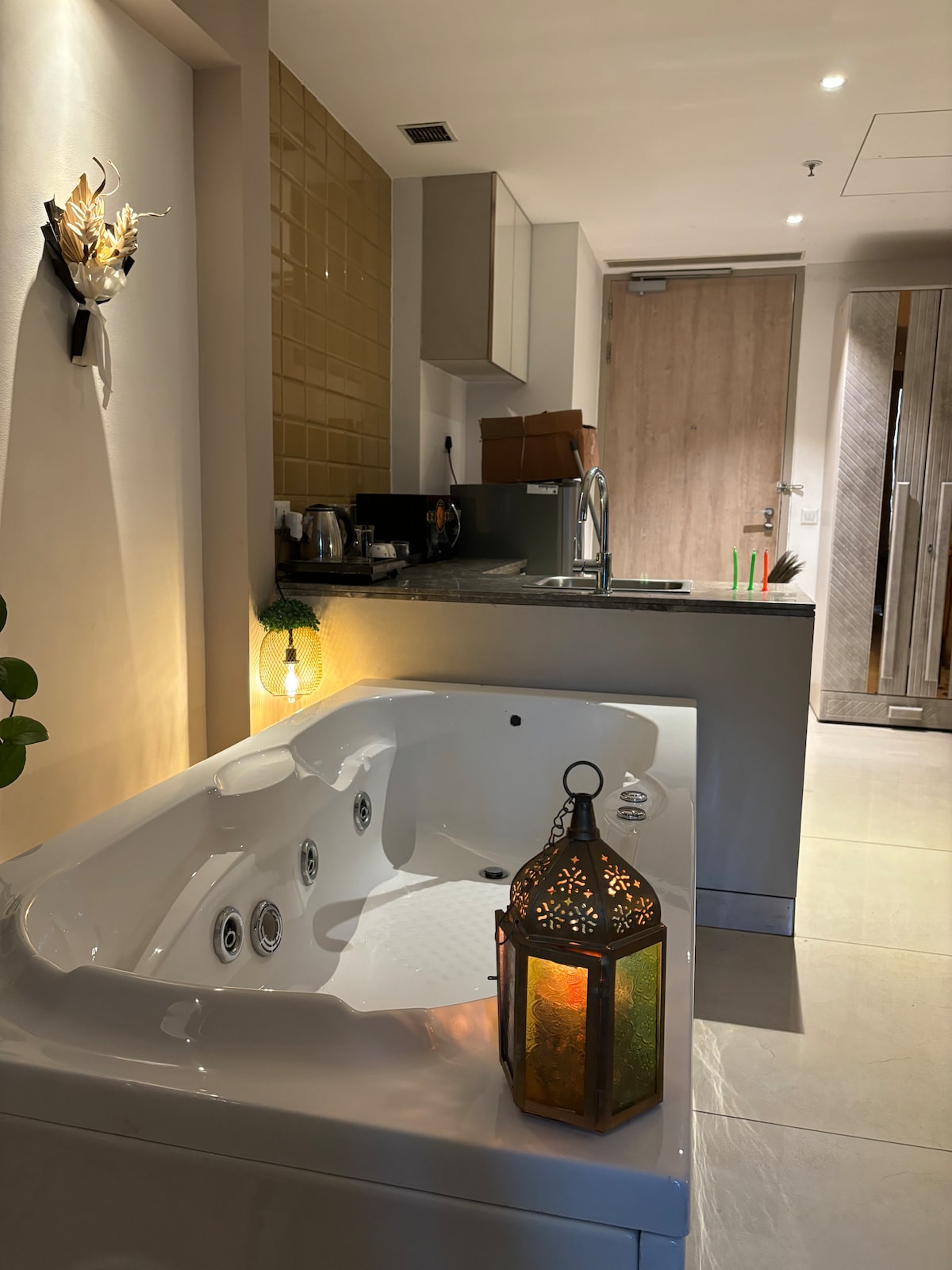 고층 건물 15층에 위치한 놀라운 스위트에 오신 것을 환영합니다. 이 2bhk는 완전히 새로운 아파트입니다. 도시 스카이라인 전망을 감상할 수 있는 넓은 전용 파티오가 있어 특별합니다. 휴식을 취하고 현대적인 건축물의 경치를 즐기기에 안성맞춤인 숙소입니다. 아파트에는 스마트 TV 3개(모든 애플리케이션 작동), 아늑한 더블 침대 2개, 사물함이 있는 큰 옷장 2개, 6인용 소파, 세련된 커피 테이블, 다리미판, 냉장고, 전자레인지, 인덕션, 전기 주전자, 토스터 등이 갖춰져 있습니다.