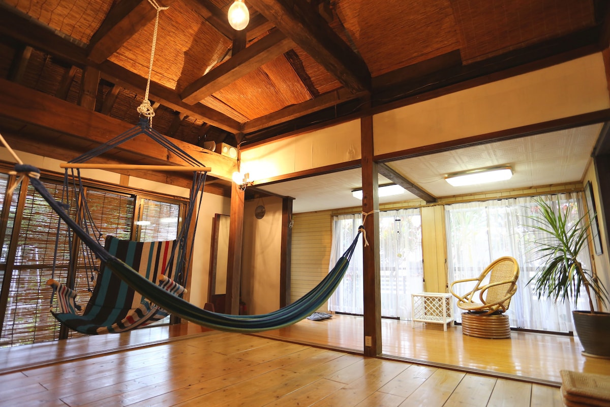 후사키 가든 빌라 ~바다와 별과 가주마 그네~ 후사키 해변까지 도보 8분, 1000㎡의 넓은 정원에 있는 대형 가주마 그네에서 바다가 내려다 보이는 붉은 기와의 오래된 가옥입니다. 매우 조용한 환경에서 밤에는 천체 망원경으로 별이 가득한 밤하늘을 감상할 수 있습니다.☆ 게스트 여러분이 편안하고 쾌적하게 지낼 수 있도록 정원에는 BBQ.피자 냄비, 해먹.전기 자전거 2대 천체 망원경 ※ 티피 텐트류(팝업 텐트, 침낭, 레저 시트 등)은 1stay 대여이며, 언제든지 문의해 주세요. ※ 실내에는 JBL 스피커, Chromecast, ReFa 샤워 헤드.무첨가 어메니티 바다에서 놀고 난 후 욕실로 바로 갈 수 있으며, 옷 건조기도 있고, 주방 도구 및 기타 필요한 장비도 준비되어 있습니다. 허브 밭에는 바질, 민트, 로즈마리 등 제철 허브와 바나나, 파파이야 제철 과일을 자유롭게 수확하여 즐기세요. 프라이빗한 시간을 지켜주는 조용한 공간 파도 소리도 들리는 우드 데크에서 즐기는 일몰 정원에는 반딧불, 붉은 메추라기, 꽃 메추라기, 꽃 벌레가 놀러 올 수도 있습니다.♪ 자연이 가득한 이케가키 섬에서만 가능한 멋진 시간을 보내세요(^ ^)