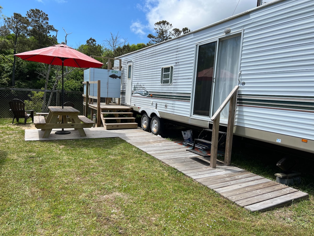 “Surf's Up” 은 벅스턴의 전용 캠핑장에 새로 리모델링한 캠핑카로, 등대와 해변까지 1.5마일도 채 걸리지 않습니다! 이 캠핑카는 전용 뒷 침실에는 퀸사이즈 침대 1개, 거실에는 트윈 침대 2개가 있는 트런들이 있는 4명이 숙박할 수 있습니다. 이 캠핑카는 전신 욕조 1개, 주방, 에어컨/난방 시설, 외부 샤워 시설 등 해변 여행에 필요한 모든 것을 제공합니다. 화덕과 피크닉 테이블과 농어 낚시 연못을 즐겨보세요. 조용하고 가족 친화적입니다. 즐거운 글램핑 되세요!