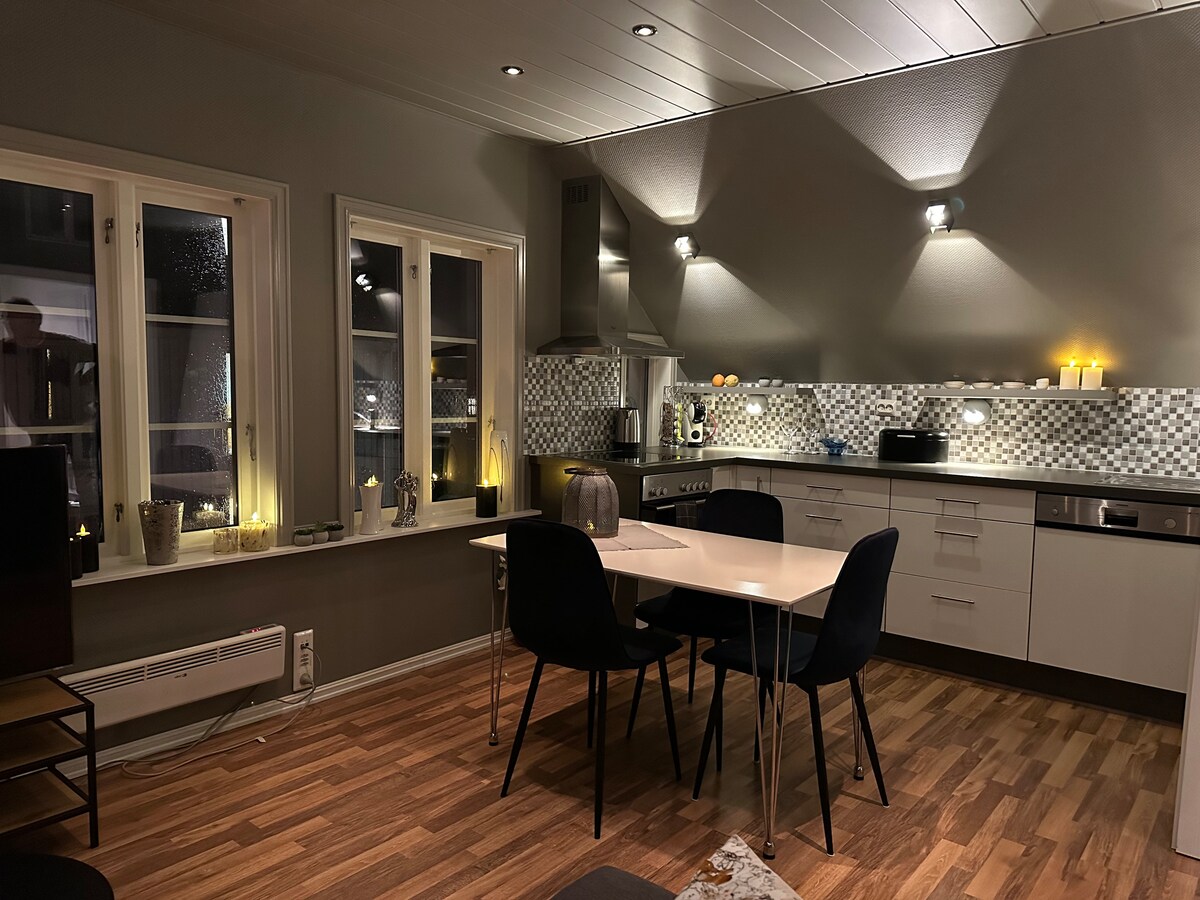 아파트는 메인 스트리트 끝에 있습니다. 모든 것이 가까운 거리에 있지만, 집 뒤편에는 정원이 있고 숙소에 최대 2대의 차량을 주차할 수 있습니다. 온수 욕조, 독립형 샤워실, 대형 주방. 거실에는 큰 더블 베드룸 1개와 소파 베드가 있습니다. 80㎡ 병원(헬세 포나)과 HVL(대학), 도심의 보행자 거리, 부두의 레스토랑 지역까지 도보로 몇 분 거리에 있습니다. 히트 펌프와 벽난로.